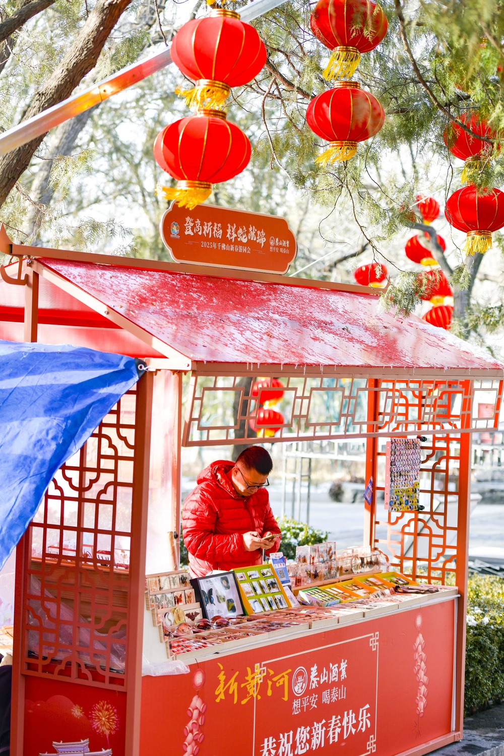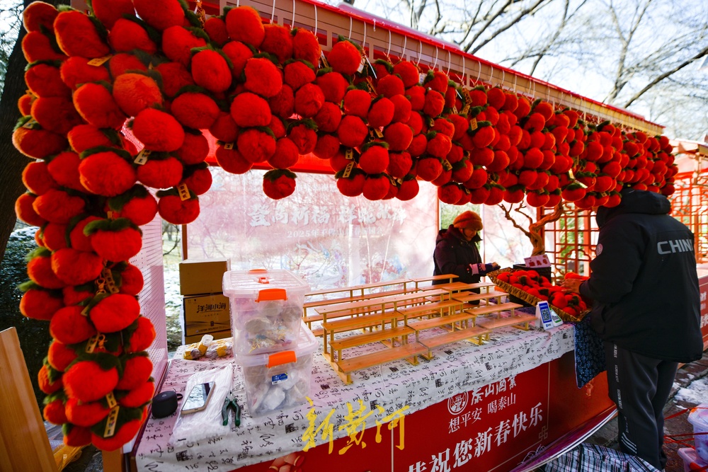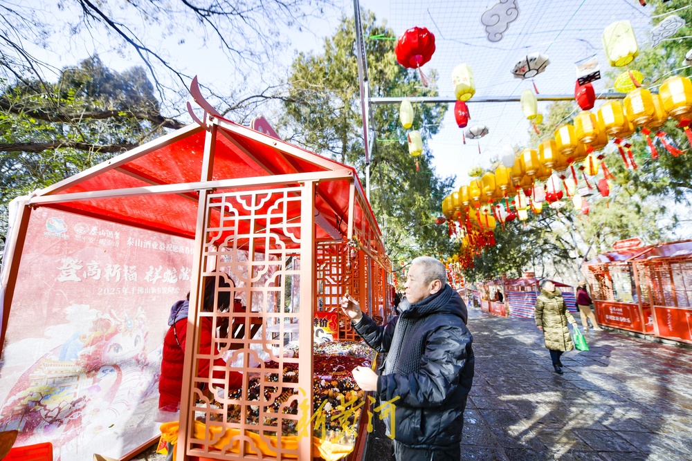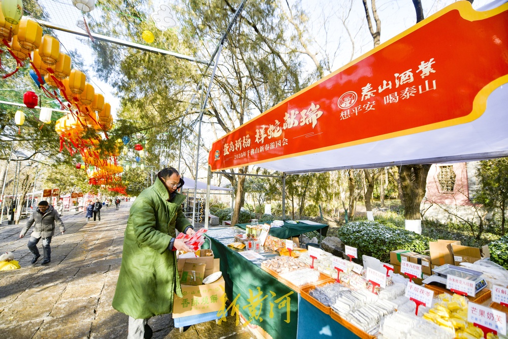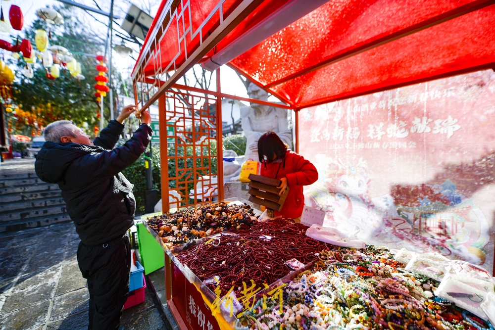 登山主路两侧的商家将各种丰富的年货运至摊位前进行布展,为游客提供非遗手工艺、文创旅游纪念品、美食等年货。