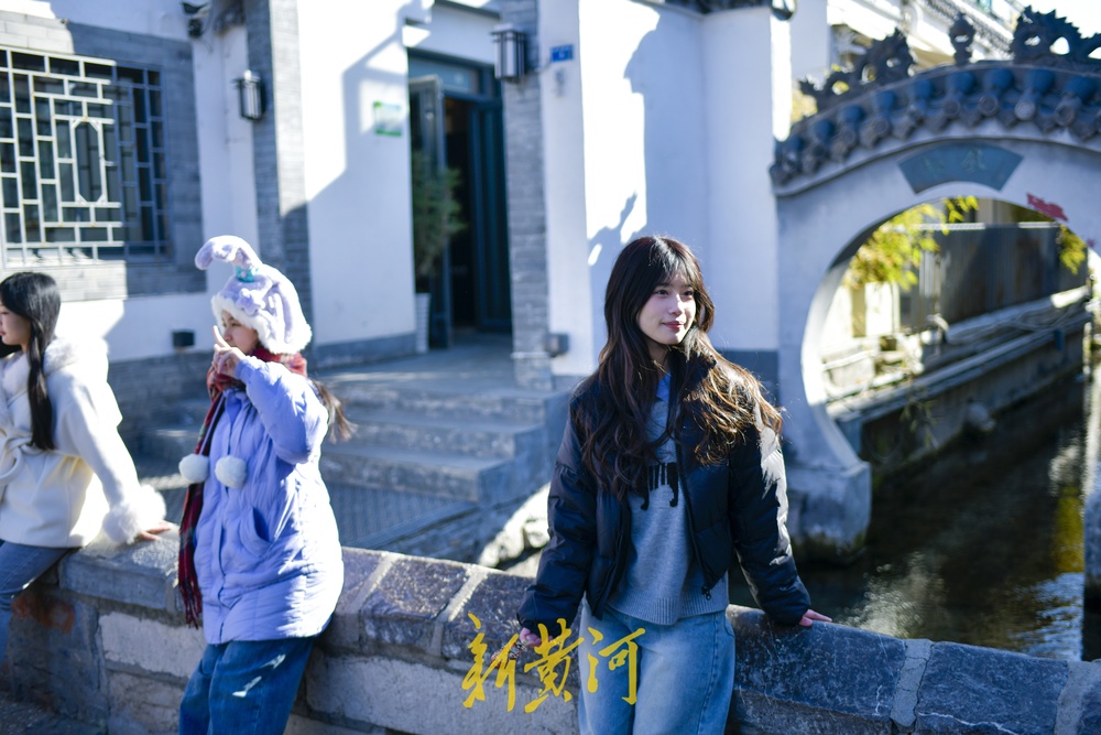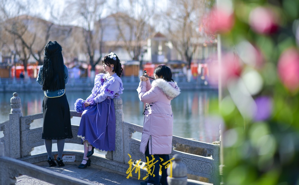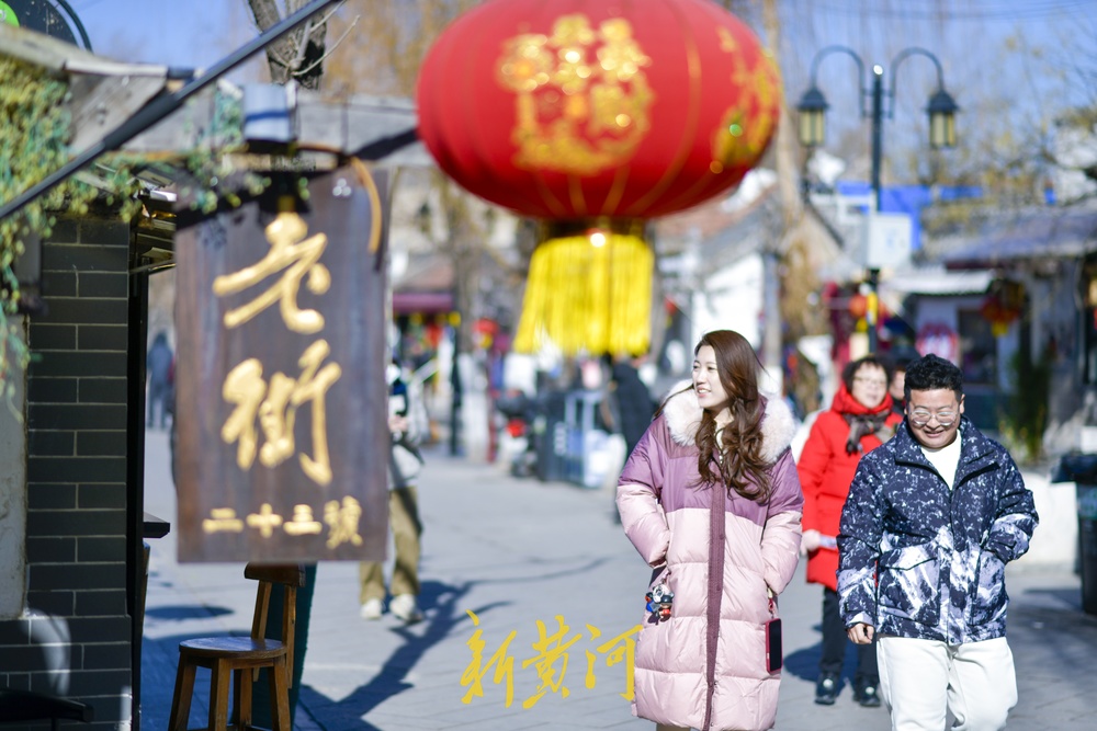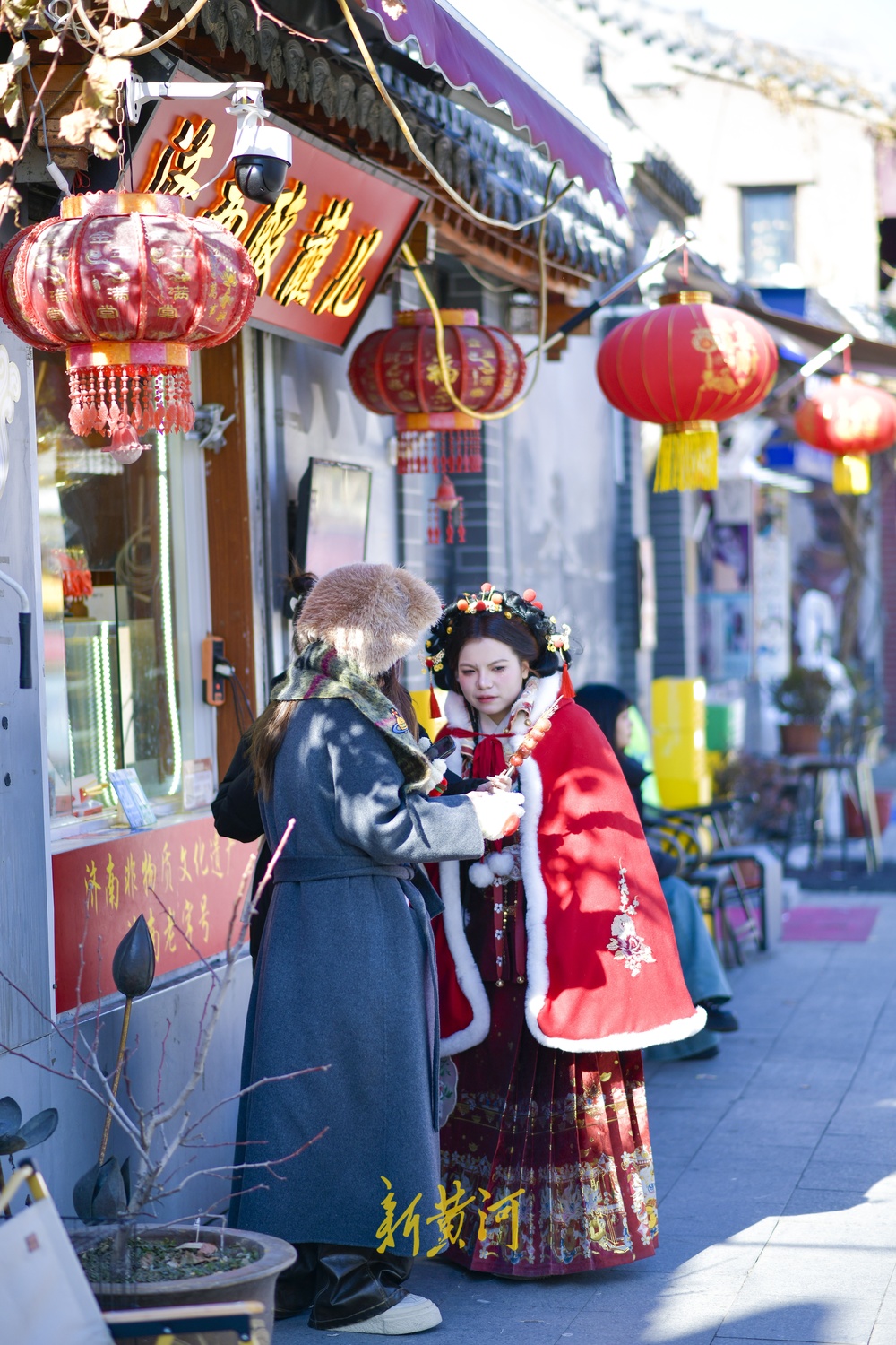 众多行人漫步老街感受济南冬日美景,不少游客身穿汉服在各个网红打卡点沉浸式体验泉城古韵。