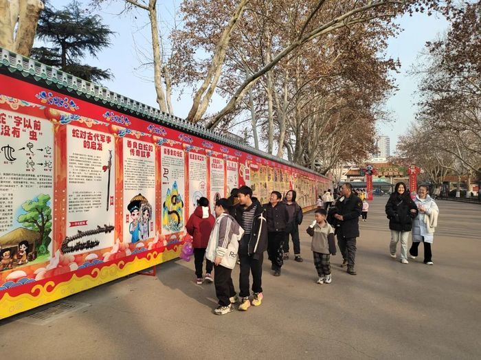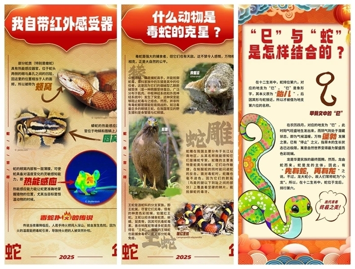 东门设置蛇年生肖文化墙,内容包括爬行动物的生物学知识、蛇的民俗文化等,营造蛇年生肖氛围的同时引导游客了解蛇这一神秘物种。