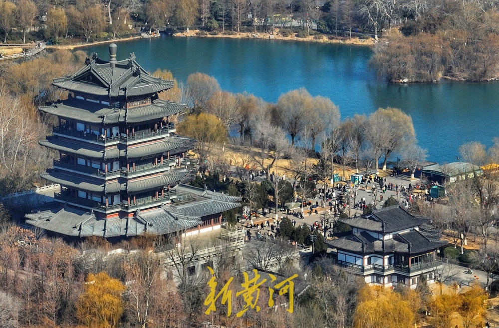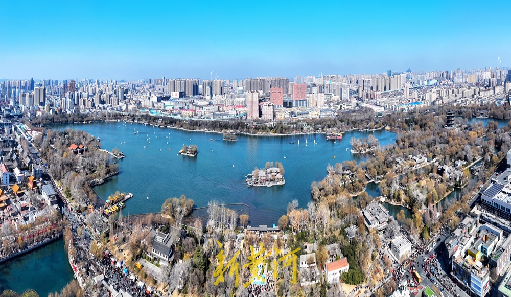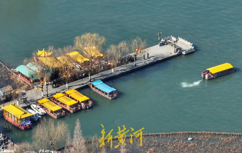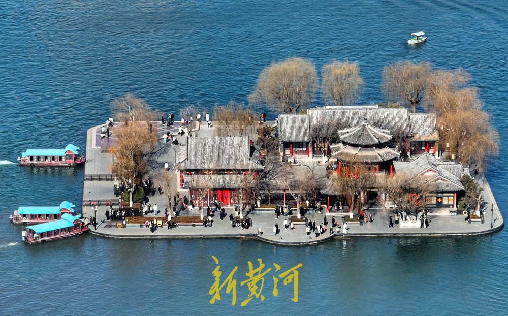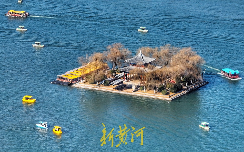 大明湖景区湖水碧绿,游客泛舟大明湖,一艘艘游船与残荷、芦苇构成了初冬的美丽画卷。