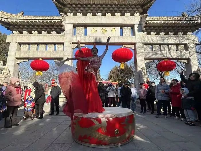 牌坊下的“鼓上舞”引起往来游客驻足围观。一名唯美女子站在雕龙大鼓上,甩着长蛇形水袖,用创意舞蹈演绎东方美感,伴随鼓点氛围营造出气势磅礴、汹涌浩荡,祝愿游客在蛇年里生活似鼓声隆隆、事业蒸蒸日上。