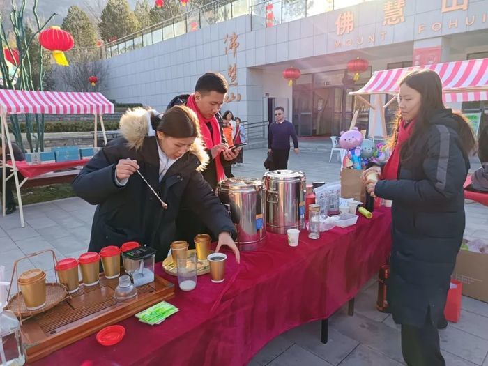 大碗茶活动现场,喜庆的中国红映入眼帘,浓厚的节日气氛扑面而来。游客们端起祈福茶慢慢品味,氤氲的茶香扑鼻而来,安静地坐下喝碗茶,品品老济南风情,感受一下以前古人歇脚喝茶的悠闲劲儿,边喝边在心里默默许个愿,新年的福气就顺着这茶香飘进人们的生活里。