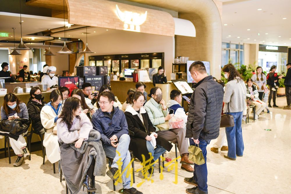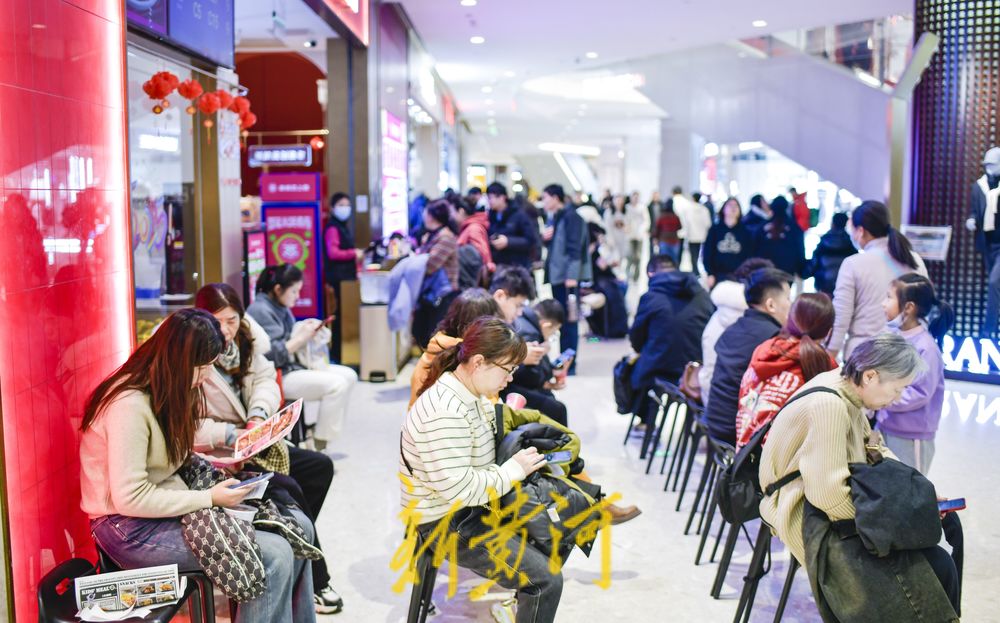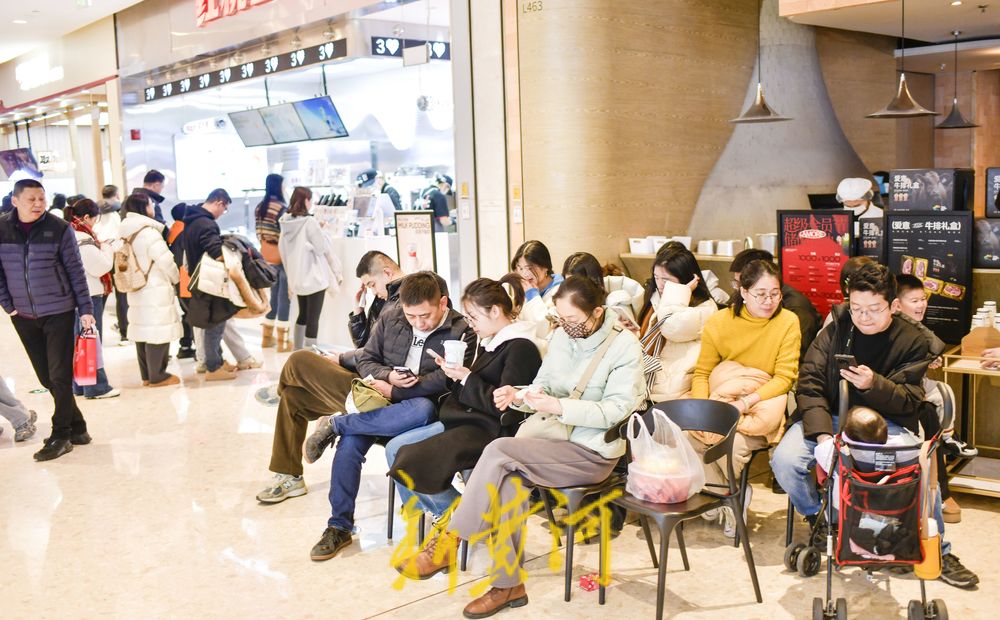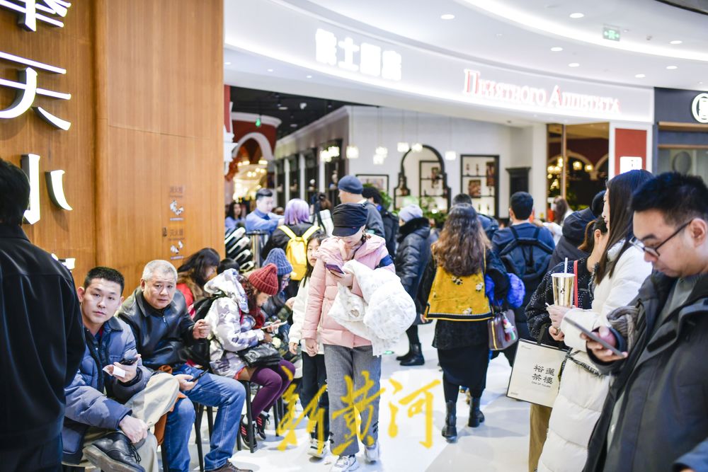 2月1日,在经十路一家商场内,从上午11点开始,餐饮店前早已被排队的人群围得水泄不通,到下午2点时,门前仍有市民排队等候就餐,就餐的市民中家庭聚餐、好友聚会成为消费主力。