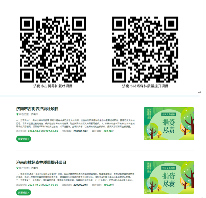 宅家也能“种春天”!2024年上线的“济南市林场森林质量提升”和“济南市古树养护复壮”项目,让尽责触手可及!扫码捐资或登录网站,一键参与。