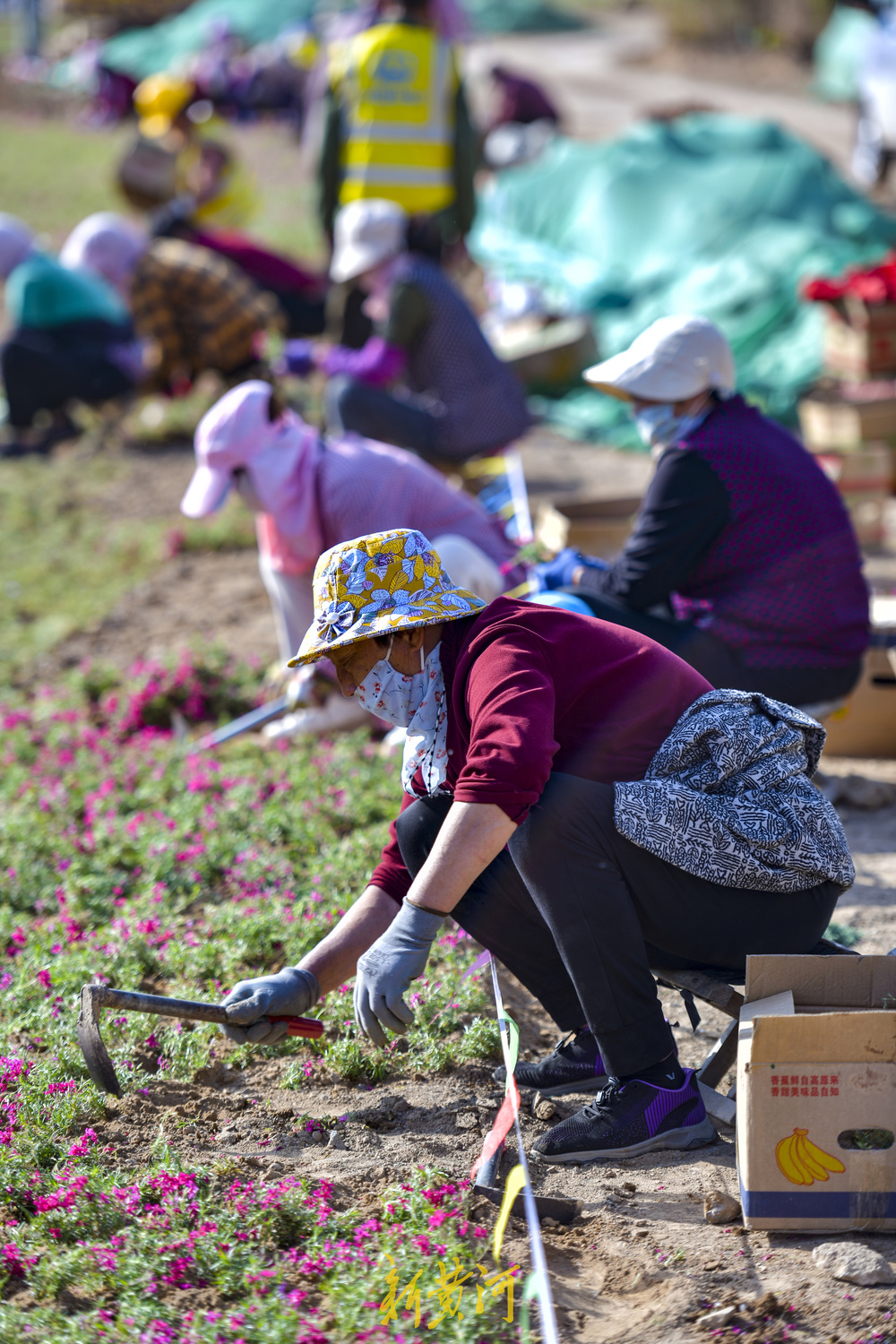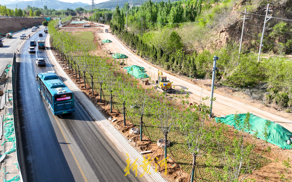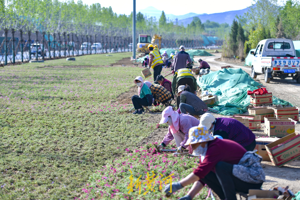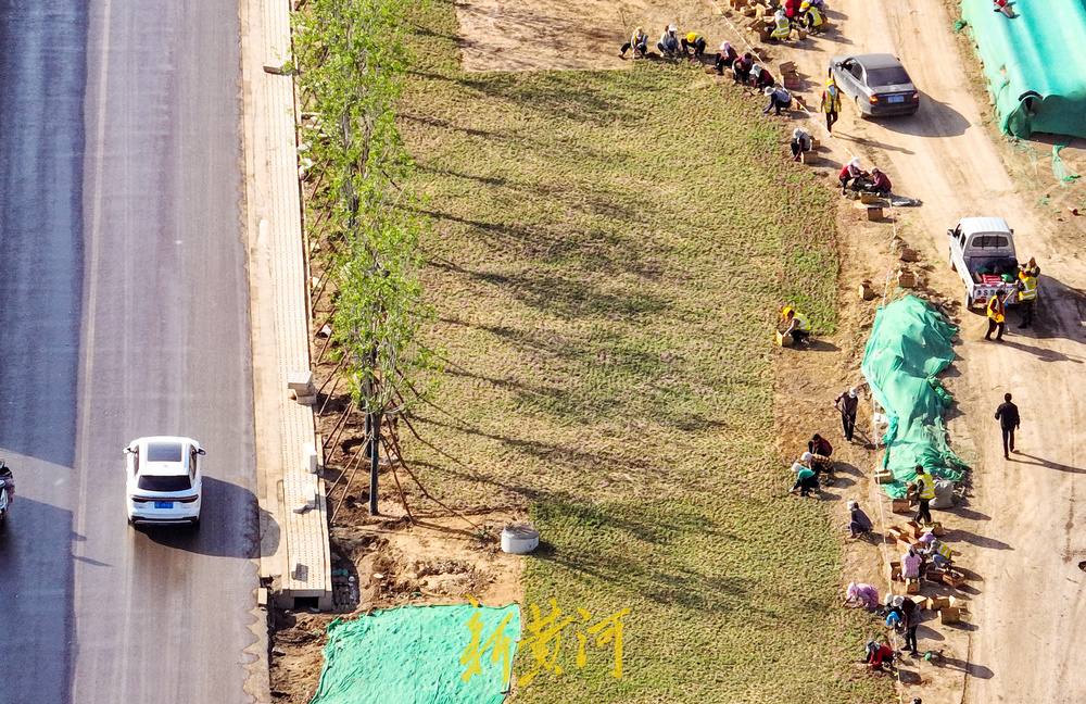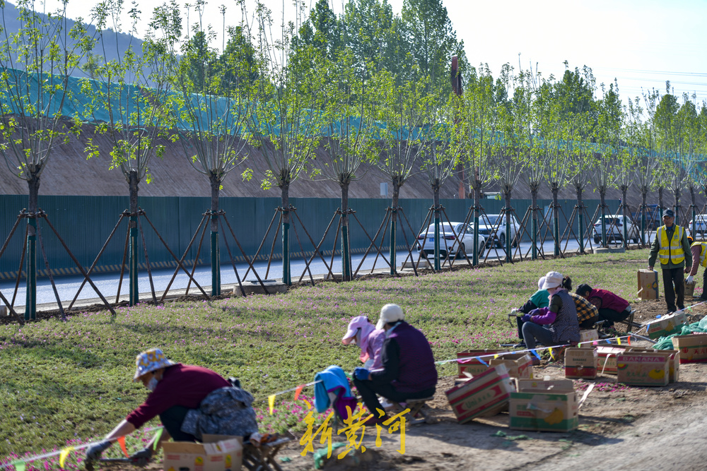 4月24日,在济南市港九路北首的扩建改造现场,半幅路面沥青铺设已经完成,道路西侧的花海景观带正在施工绿化,园林工人正在栽植数万株网红花卉福禄考花,全部栽植完成后将在港九路的北口形成数千平方米的花海景观。