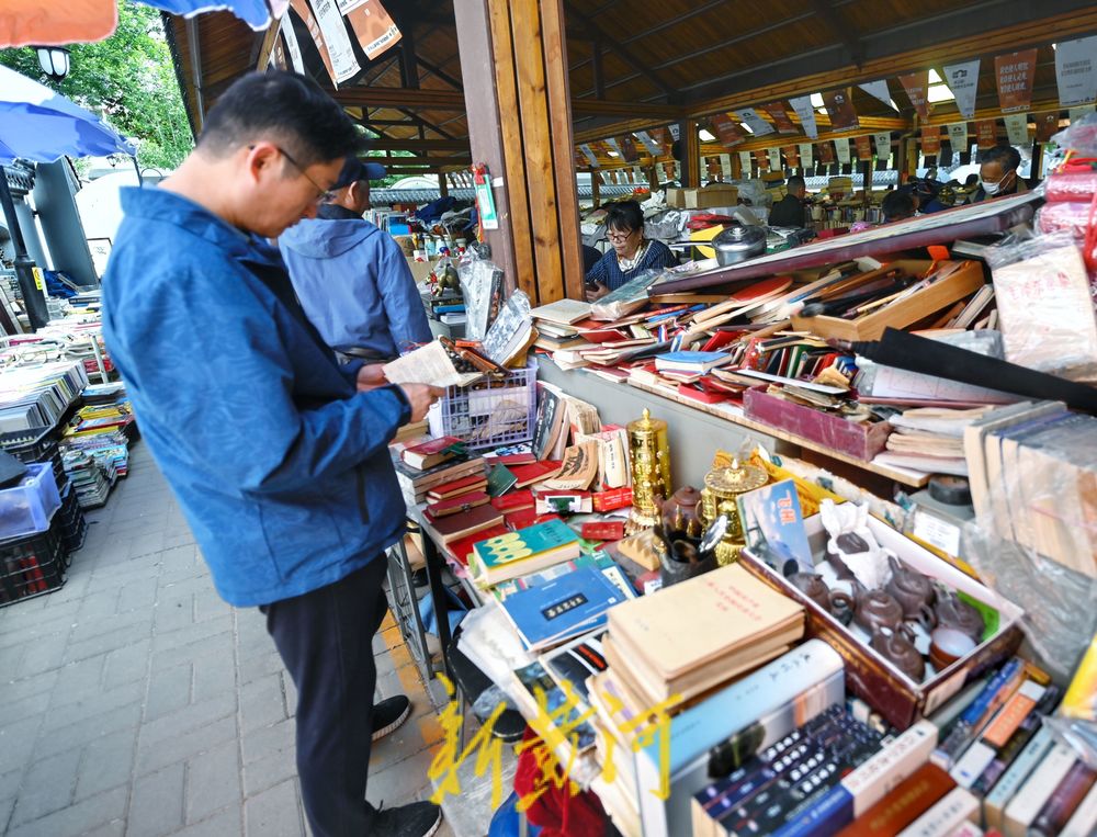 5月2日上午,中山公园“中山书苑”内,暂时放下工作和学习的市民利用假日来到旧书市场寻宝探物,在旧书摊里享受难得的静谧时光。中外名著、连环画、工具书等等,除了大量的书籍,还有一些儿时记忆中的小东西,带日历的时钟,收音机,磁带,算盘和玩具…尤其是一些老档案、老照片,吸引了大量的济南甚至是外地的收藏爱好者来此淘货。