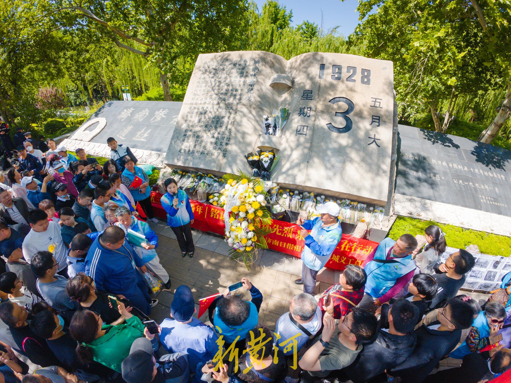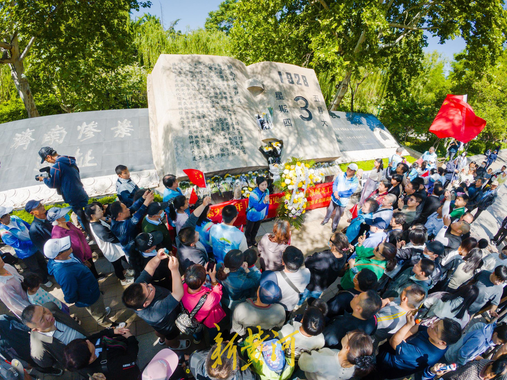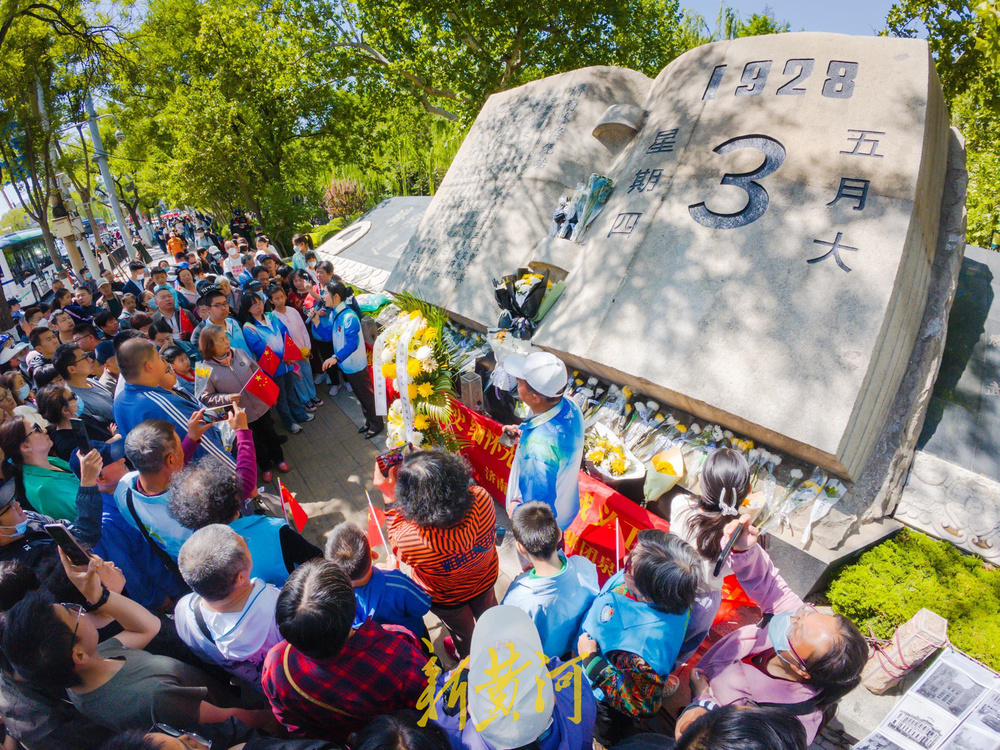 9时30分,五三纪念园内,全体人员向罹难同胞默哀,各界代表依次向纪念碑敬献素菊白绢的花篮。随后,共同敲响象征历史警示的五三钟。10时整,全市防空警报长鸣三分钟,以钟声、警报告慰英灵,警示后人铭记历史、珍爱和平。