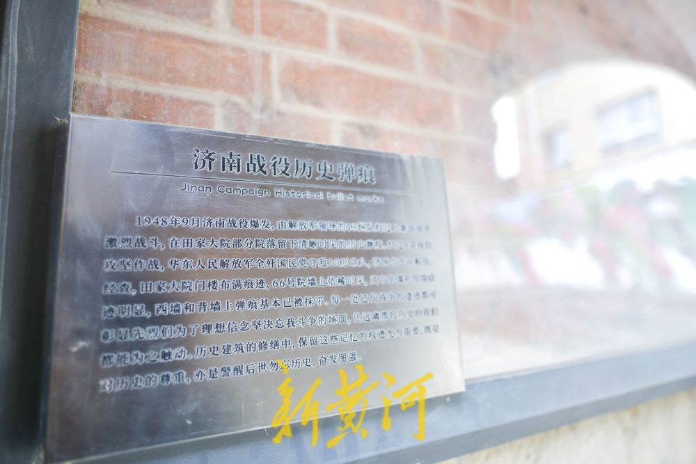 其中在田家大院66号的院墙上,有多处济南战役的历史弹痕,至今依然保存完整,工作人员在弹痕外侧安装了保护层,并设了“济南战役历史弹痕”讲解牌,让更多的市民了解老建筑的历史。