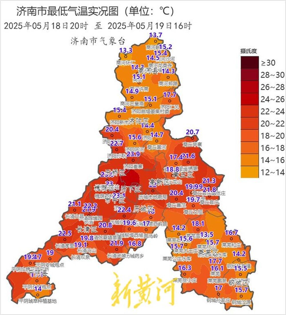 19日,新黄河记者从济南市气象台获悉,受大陆暖高压脊影响,19日济南市出现35℃以上高温天气。19日白天国家级气象观测站最高气温38.3℃,出现在济阳,市区37.7℃,其余介于35.9-38.2℃之间。章丘、长清、平阴、济阳、莱芜最高气温突破历史同期(5月中旬)高温极值。19日白天自动气象观测站最高气温为41.3℃,出现在高新埠东。全市最高气温37℃及以上的站点125个(占全市58.1%),35℃至37℃的站点72个(占全市33.5%)。