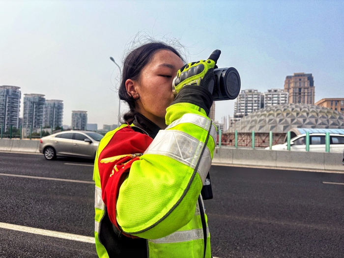 记者注意到,这套装备把高文蓉包裹得近乎密不透风,只是在路面巡逻十几分钟,豆大的汗珠就从她的脸颊滑落。休息时,她褪去骑行衣,短袖早已被浸湿。