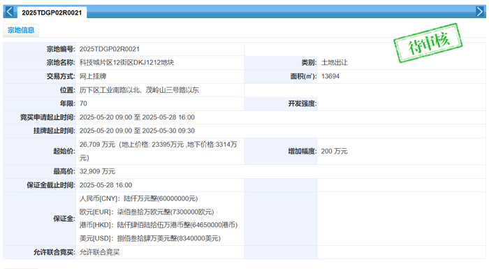 本次出让的科技城片区12街区DKJ1212地块位于历下区工业南路以北、茂岭山三号路以东,土地用途为城镇住宅用地,土地出让面积13694平方米,容积率2.3,楼面起拍价约8480元/平方米。根据挂牌文件,土地竞得人须无偿配建、代建托儿所(托育机构)、社区卫生服务站;须一次性向历下区住房和城市建设局指定账户缴纳科技城片区安置房回购款。