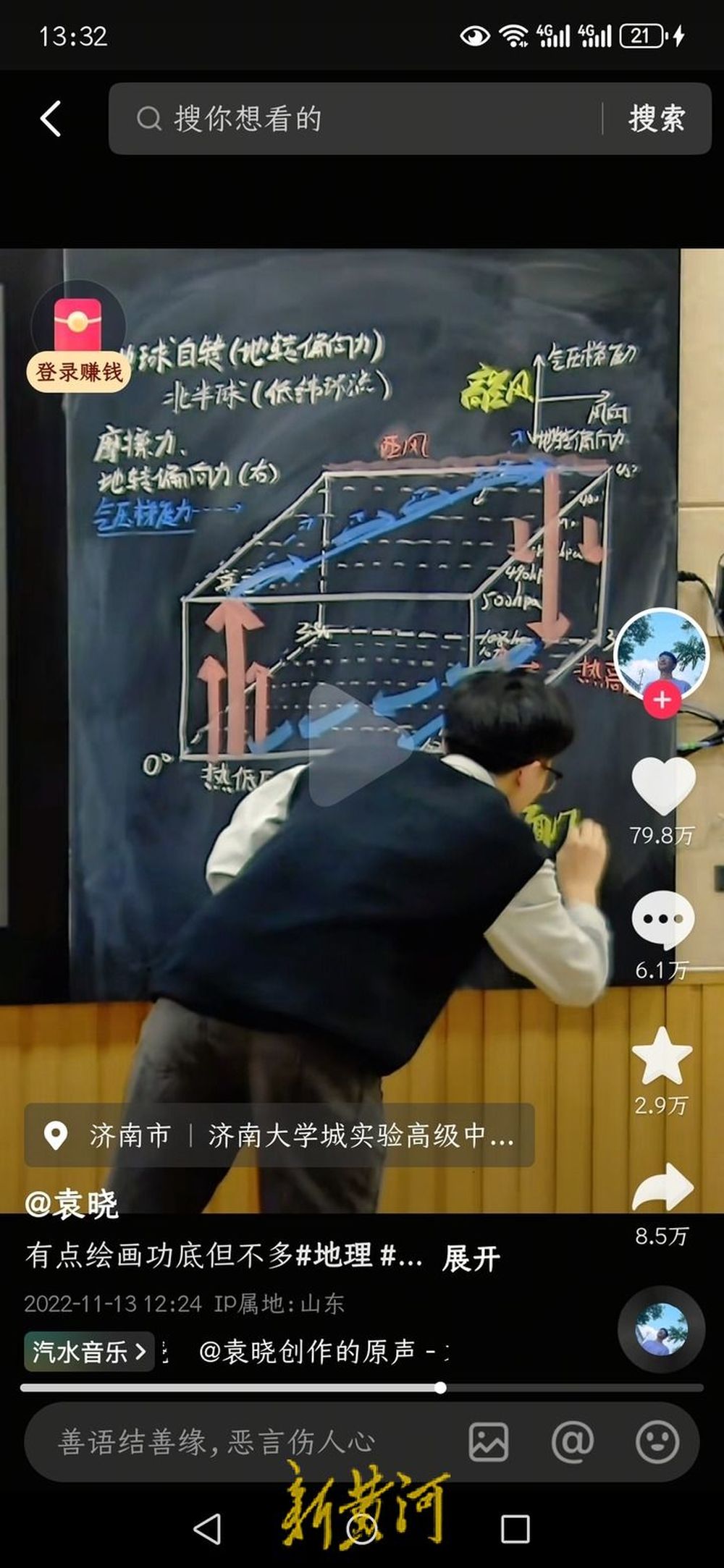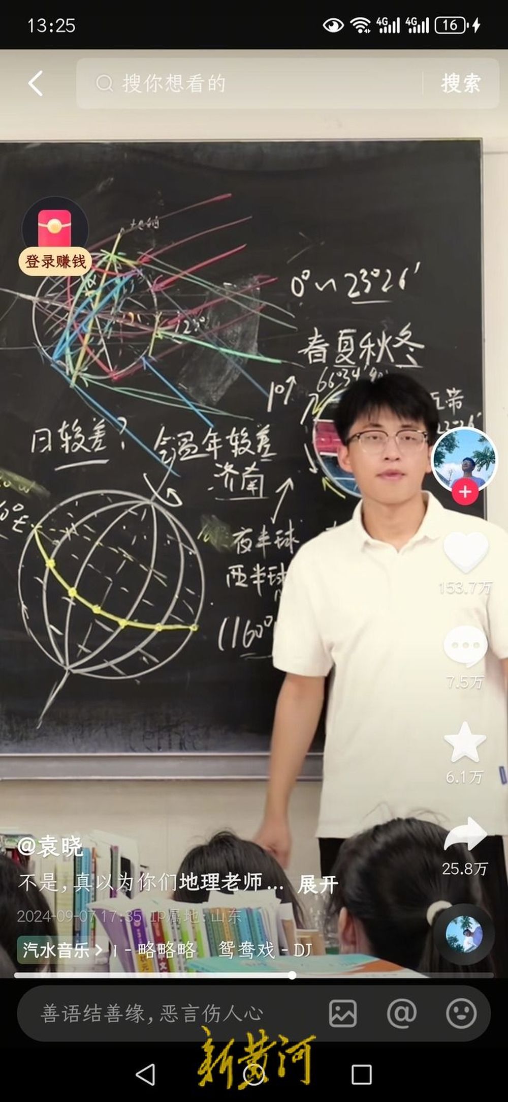“看,你又多了一位地理教师朋友。”这是袁晓抖音号的自我介绍。目前,他已经发布了257个视频作品,其中热度最高的一条视频发布于2024年9月7日,点赞量达153.7万,内容同样是地理板画。“我见过最美的彩虹遇见了太阳。”“他这个图出来的时候我以为是物理呢。”“我就不行,我那个地球永远是瘪的,主打就是随性。”……已有7.5万网友在视频下留言,内容更是五花八门。