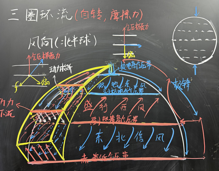 讲座中,袁晓结合多年教学经验与学生案例,生动讲解初高中地理学科转变及学习策略,从内容变化、学科差异、心态调整和方法升级等维度展开分享。针对初高中地理知识体系的断层,他以“三圈环流”为例,通过手绘板书图例展示,直观梳理初中基础知识与高中自然地理原理的衔接脉络。