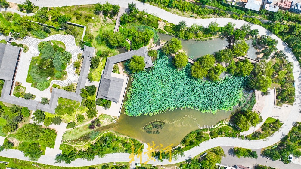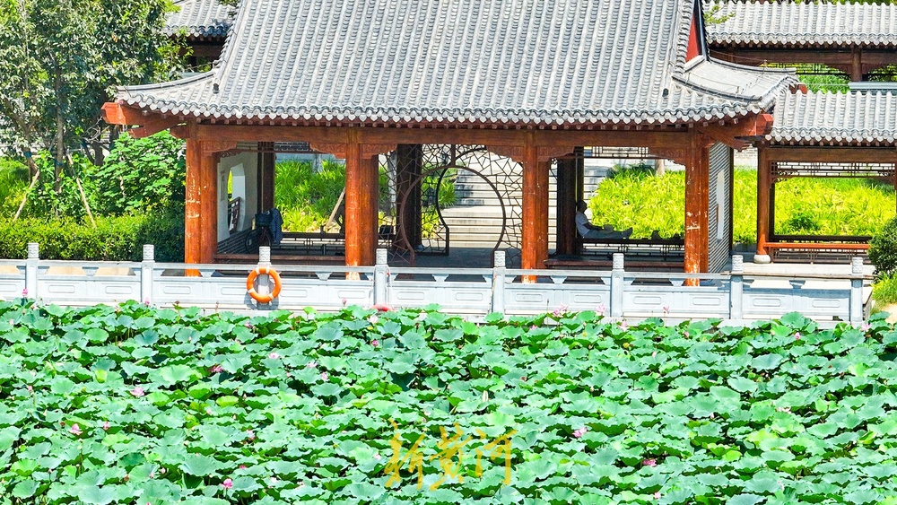 在古朴的亭台楼阁映衬下,荷花宛如跳动的音符,奏响夏日乐章。