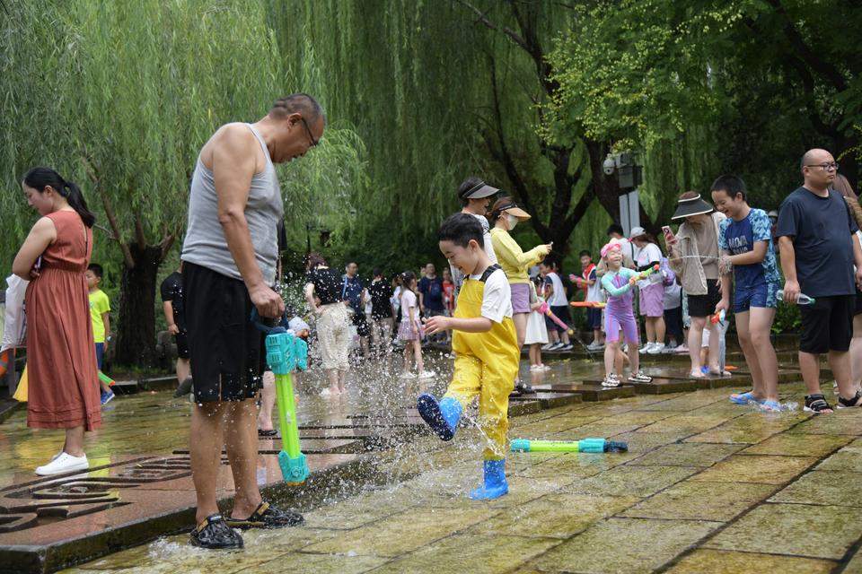 眼下,2025年济南国际泉水节正在火热进行,一系列赏泉活动正在上演,在炎炎夏日给大家送来阵阵清凉。在五龙潭泉畔的“清泉石上流”亲水区域,游客既可以体验泉水没过脚面,感受缓缓流淌的清凉,又可以来一场酣畅刺激的水枪大战,受到大家的欢迎。陕西游客陈聪就说道,“天气有点热,但是在这水边感觉还行,孩子玩得挺好的 。”