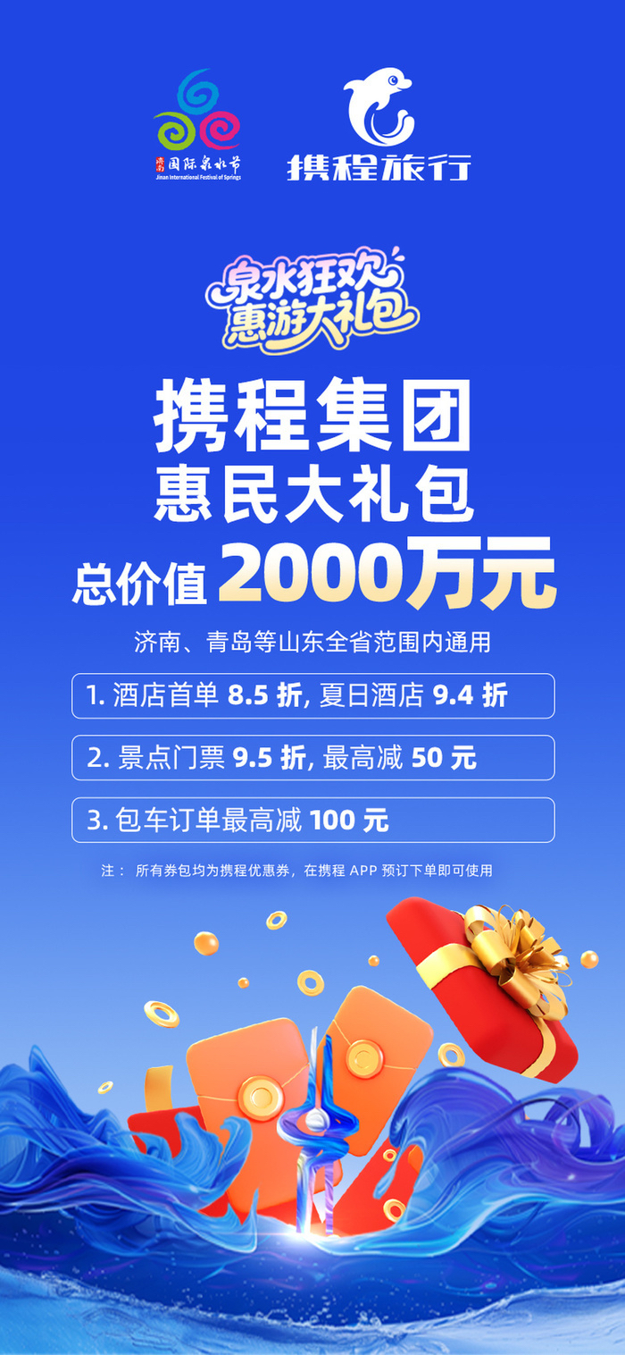 2025济南国际泉水节期间,携程、京东、淘宝、滴滴等12家企业、景区携手为济南市民和游客带来1.6亿元的泉水节“大礼包”。其中携程联动山东全省区域提供2000万元补贴,覆盖住宿、交通、景区等领域,目前使用已经过半。