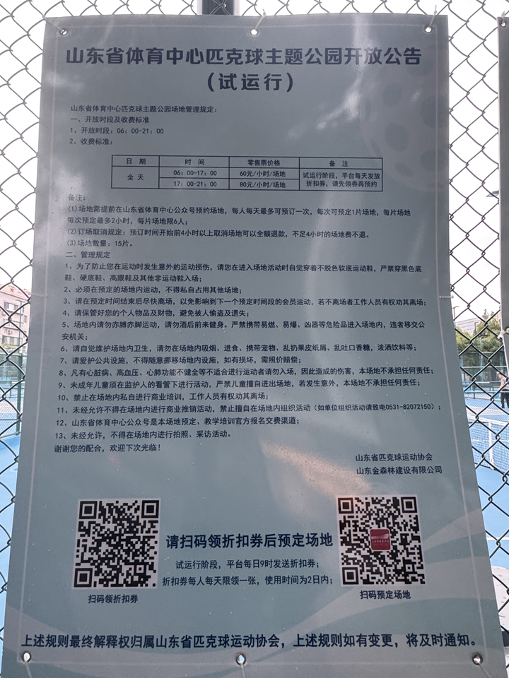 近日,有市民反映称,山东省体育中心(以下简称:省体)匹克球主题公园同比羽毛球、篮球场地收费较高,匹克球场地要60元—80元/小时,近日,记者走访发现,上述匹克球主题公园目前属于试营业阶段,试营业阶段需扫码预约时段进场。工作人员回应称该价格在同类营业的运动场馆属于低价,且试营业期间可领取优惠券进行抵扣,后续会考虑推出会员卡等优惠。