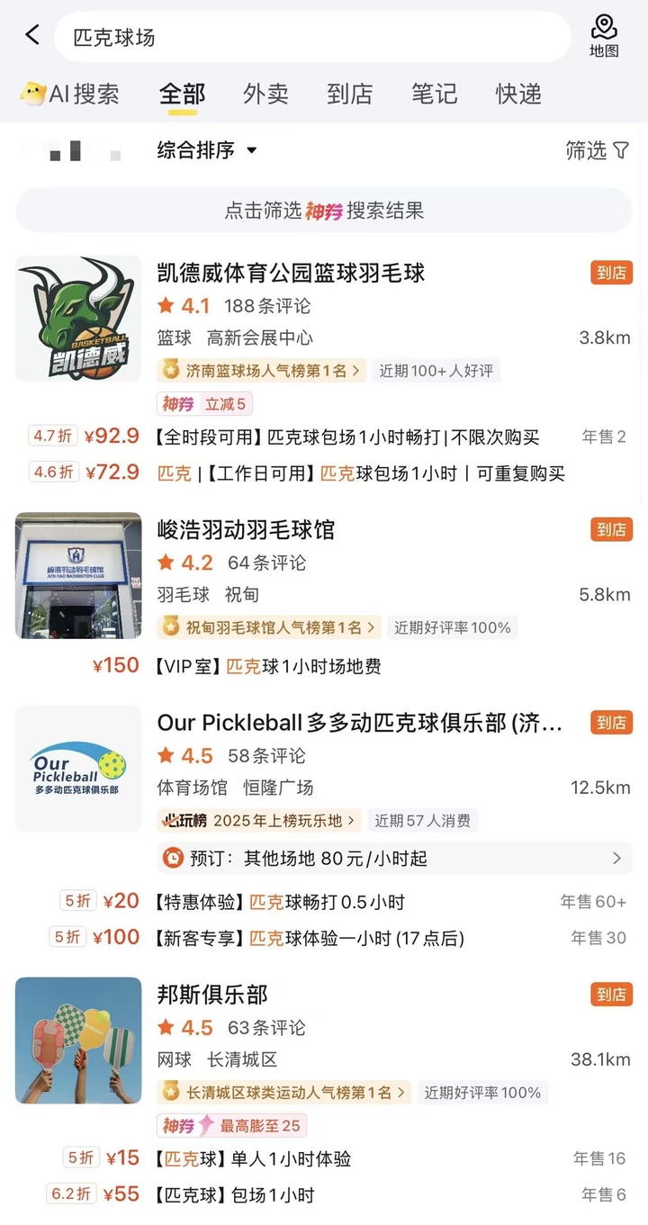 此外,记者在高德地图及美团团购平台搜索发现,目前济南市区匹克球场地较少,收费标准大约为每场地60元—100元/小时。在团购平台,部分场地有新人特惠体验价格,例如15元单人一小时体验、20元畅打0.5小时等,新人体验价格较优惠。