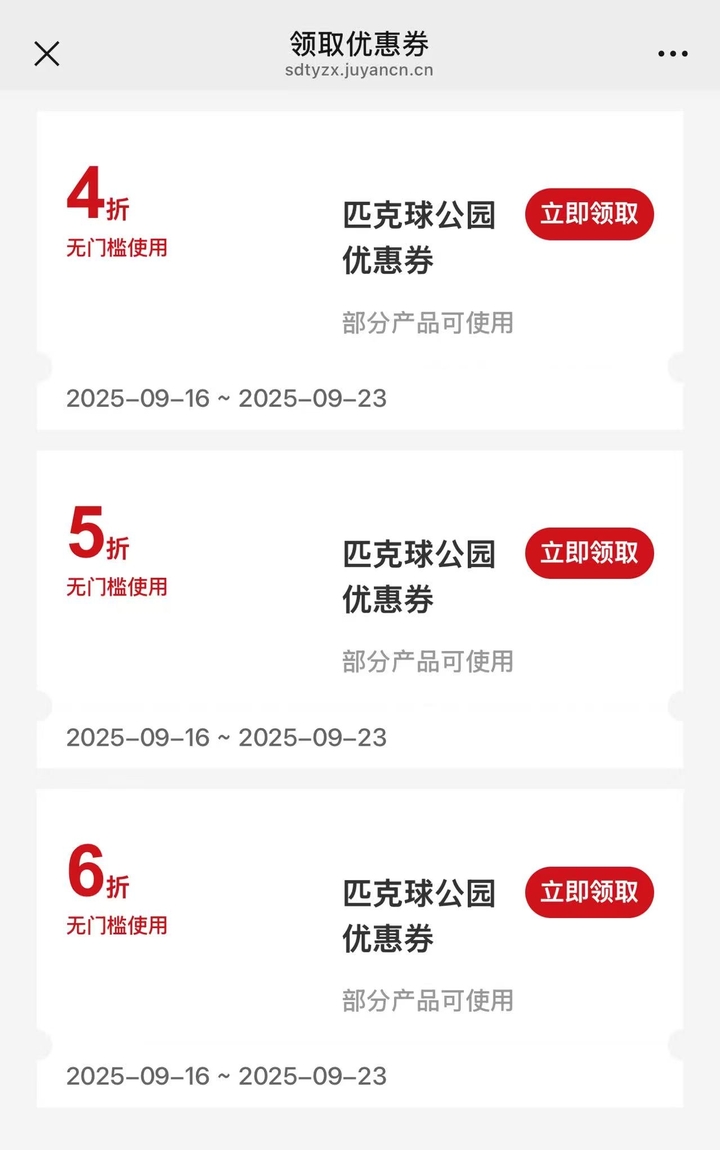 记者了解到,匹克球主题公园于2025年9月9日开始试营业,每天6:00—21:00开放。上述工作人员介绍,目前试运行阶段以优惠券预约为主,后续有考虑推出会员卡等其他优惠活动。22日下午记者实测,关注其官方公众号,扫码预约场地后,领取到三张分别为4折、5折、6折的匹克球公园优惠券。