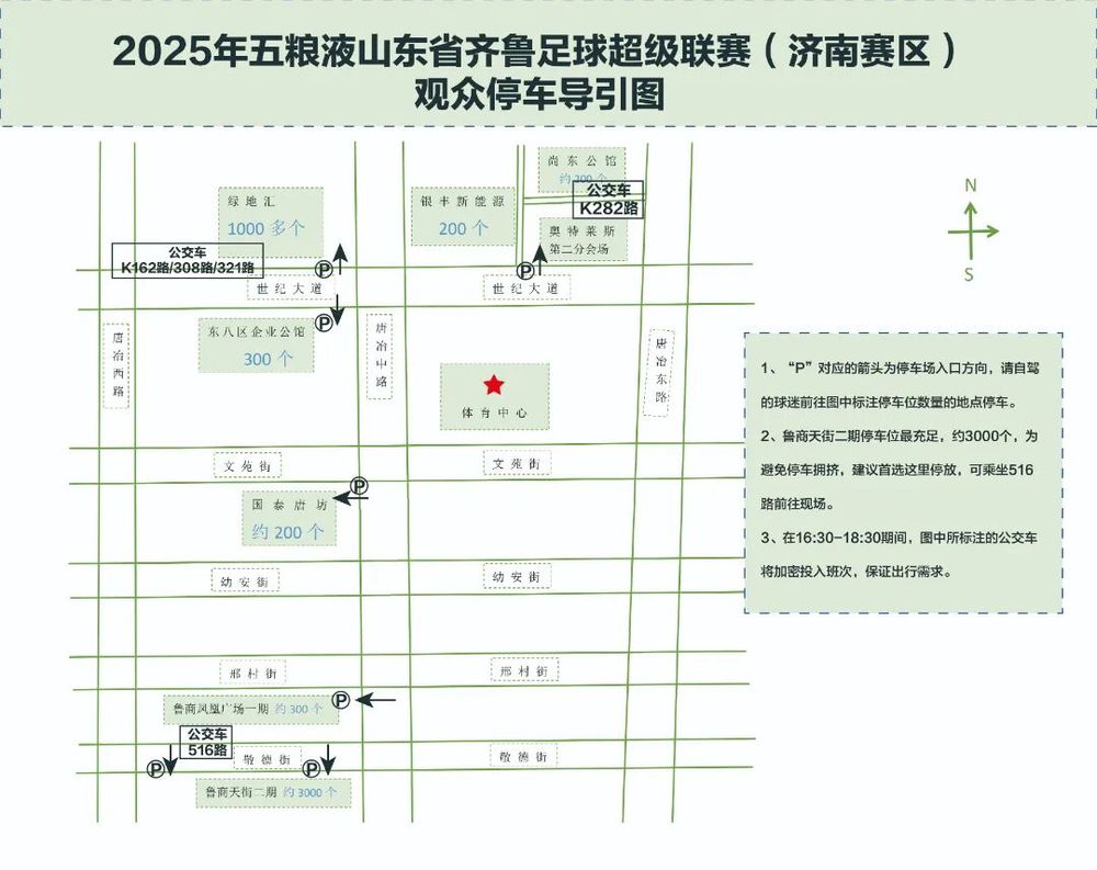 赛事当天,历城区体育中心、历城区文博中心、历城区政务中心停车场暂不对外开放。开车的球迷朋友可在鲁商一期二期停车场、国泰唐坊停车场、首创奥特莱斯停车场、东八区企业公馆停车场、绿地汇停车场等地停车。按照图2标注乘坐公交车前往现场。在16:30-18:30间,公交公司将增加周边公交运力投入。