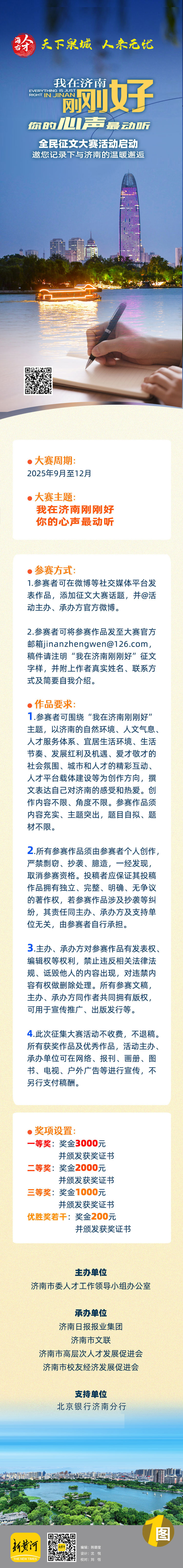本次征文不设职业、年龄、地域限制,无论是久居济南的“老济南”,还是初来乍到的“新市民”,甚至是曾与泉城有过交集的过客,只要您有与济南相关的故事、感受或思考,均可提笔参与。我们期待您: