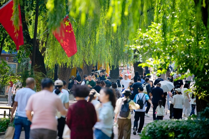 不远处的百兽迎宾广场,则成了爱国情感的汇聚地。《我和我的祖国》那熟悉而动人的旋律多次响起,由领唱员、志愿者和自发加入的游客组成的快闪队伍,用最真挚的歌声表达着对祖国的热爱与祝福。
