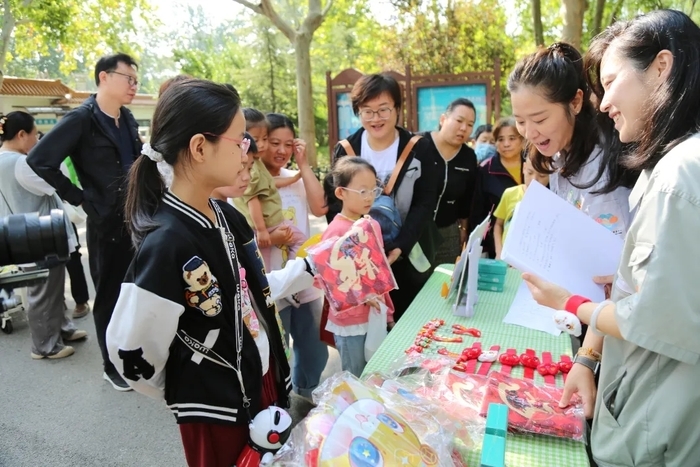 在色彩缤纷的动物大篷车周围,聚集着踊跃参与活动的游客。济南动物园工作人员热情地邀请游客现场扫码参与动物知识问答。“请问大熊猫的主要食物是什么?”“松鼠尾巴有什么作用?”这些趣味问题让游客在游玩的同时增长知识。答对问题的游客可获得精美动物玩偶、特色徽章等节日礼物,孩子们脸上洋溢着开心的笑容。