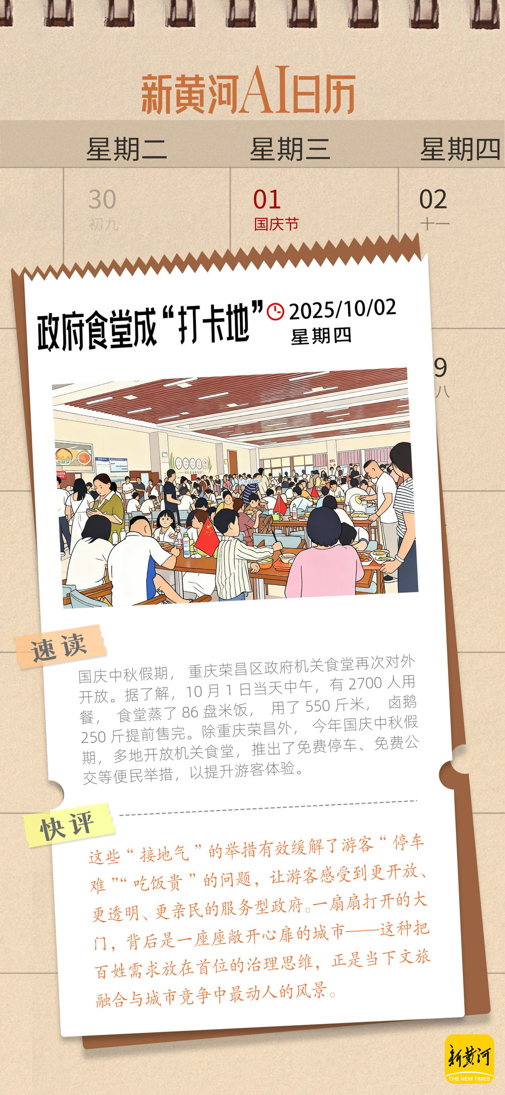 长达8天的国庆、中秋“双节”假期让人们离工作远一些,与生活更近一些。人们无论是在旅途,抑或宅居家中,新闻也总是常伴左右。新黄河推出“长假新闻热榜AI日历”系列海报集,一起品评热点,不错过身边大事件。