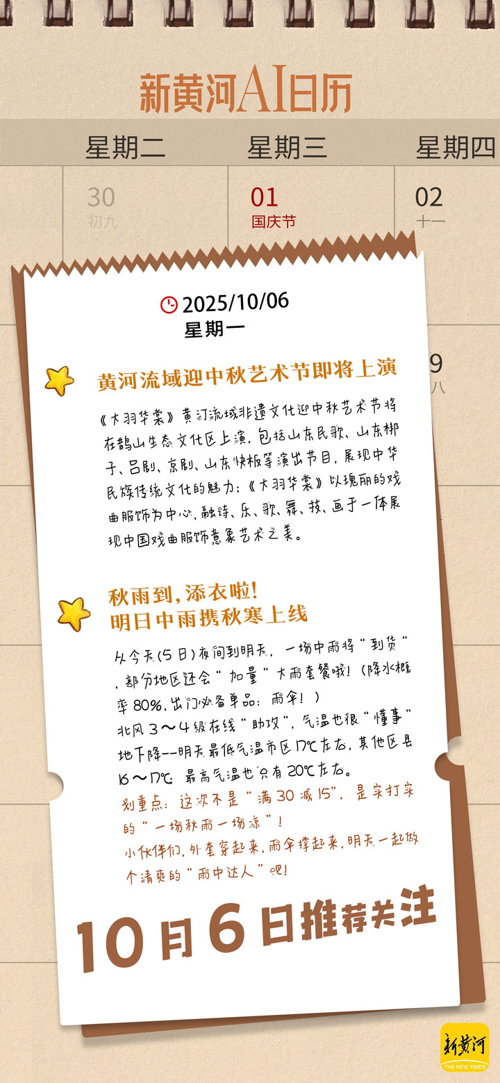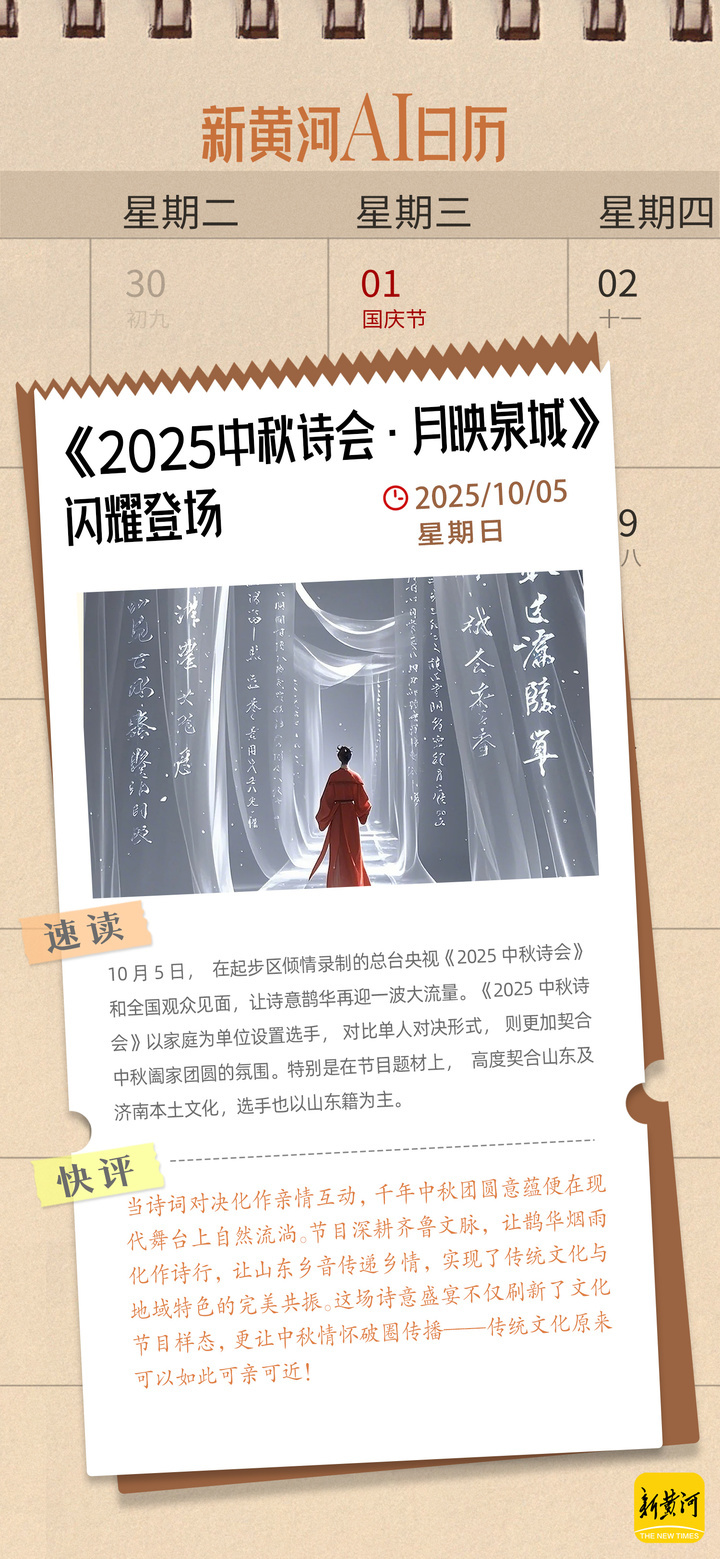 中秋诗会闪耀假期、国庆档电影总票房破13亿元、山东200家景区火爆 | 新黄河热榜AI日历