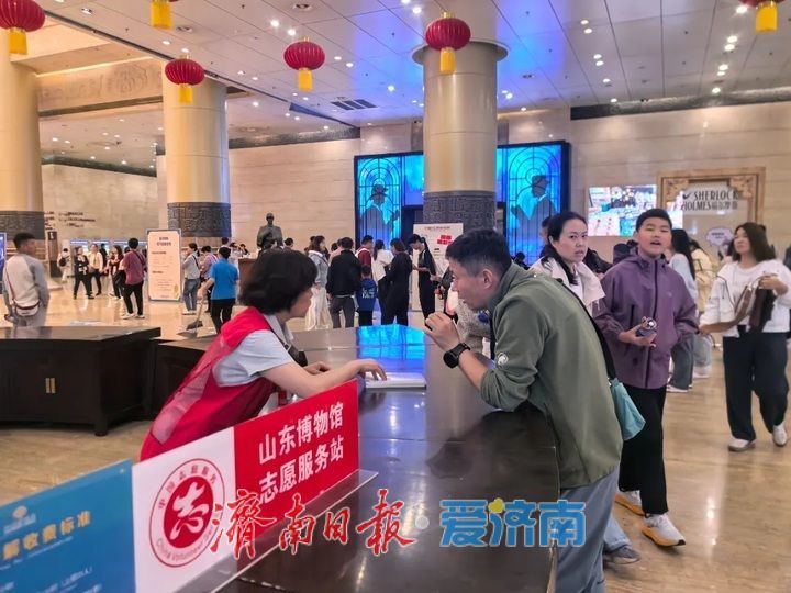 志愿者实行分布式岗位设置,在咨询台、安检口、电梯旁、展厅等关键点位提供引导服务,实时疏导客流;在“海岱日新——山东历史文化陈列”“鲁王之宝——明朱檀墓珍藏”等热门展厅进行定时讲解240场,服务惠及5000余名观众。为观众深度解读文物内涵,有效缓解观展压力。同时,自助语音讲解器、AR导览设备为观众提供个性化、沉浸式参观体验,满足多元需求。