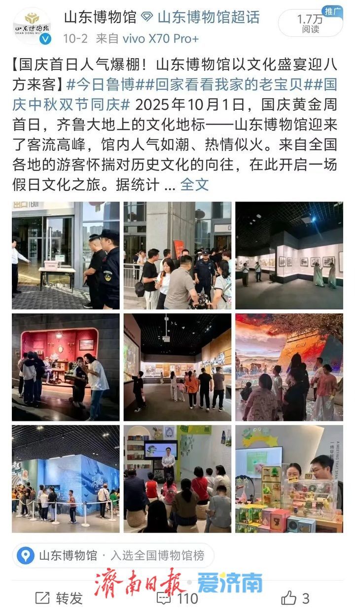 当国庆红旗邂逅中秋明月,山东博物馆以一场跨越时空的文明对话,将家国团圆的温情注入千年文物的肌理。10月1日至8日,山东博物馆每天延时开放到18:00,更打破“周一闭馆”惯例,以满满诚意迎接八方来客。平均游客每天2.4万多人次,8天累计接待游客近20万人次,镇馆之宝前的驻足、鲁博学堂里的互动、文创区的打卡、VR体验的惊叹……共同勾勒出这个假期最动人的文化图景。