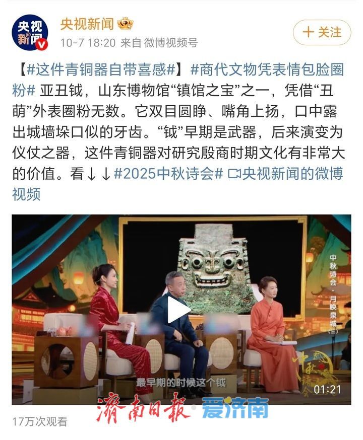 国庆假期,山东博物馆官方政务微博每日发布多条假期动态、展览推荐、参观攻略。自带喜感的镇馆之宝商代文物亚醜钺登上2025中秋诗会,凭借“丑萌”表情包脸圈粉无数。