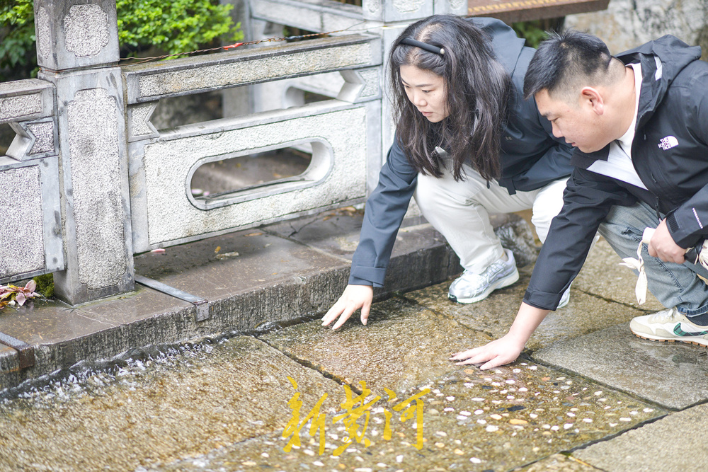 在五龙潭公园的东流泉,泉水涌出泉池,沿着石板路汇入相邻的古温泉,古温泉的泉池也已“喝饱”,汩汩泉水从古温泉的东侧石栏下方的石板中冒出,沿着原来的东流水街流淌再汇入月牙泉泉池中,形成了五龙潭公园内第二处清泉石上流景观。