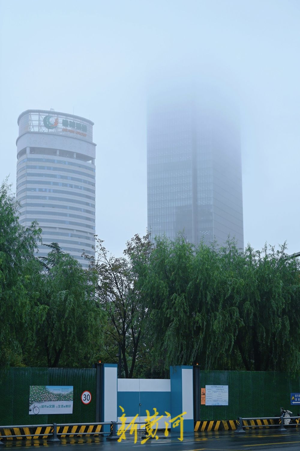 老城区里的高楼建筑被雨雾笼罩,远远望去若隐若现,仿佛披上了一层轻纱,与道路两侧的垂柳相互映衬,别有一番情趣。