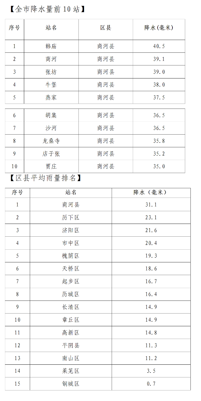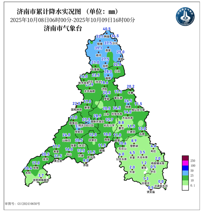 济南市气象台根据气象和水文观测站网统计,10月8日6时至10月9日16时,全市平均降水量15.7毫米,其中商河县韩庙最大,达到40.5毫米。全市平均降雨量折合水量约1.6亿立方米,其中,市区20.6毫米,历城区16.4毫米,长清区14.9毫米,平阴县11.3毫米,济阳区21.6毫米,商河县31.1毫米,章丘区14.9毫米,莱芜区3.5毫米,钢城区0.7毫米,高新区14.8毫米,南山区11.2毫米,起步区16.7毫米。全市200个测站中有31个降雨量超过25毫米。