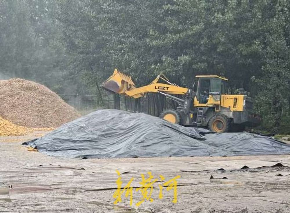 在起步区孙耿街道东盐村晾晒场上,种粮大户闫振正驾驶挖土机,铲斗缓缓落下,将玉米兜起来,晃晃悠悠移向旁边脱粒机。脱粒机的铁皮机身被雨打得“噼啪”响,嗡嗡的震动声混在雨声里,机器里“轰隆”的碾压声盖过了近处的雨声,金黄的玉米粒裹着点潮气,从出料口涌出来,落在卡车上。一会儿时间,挖土机来来回回跑了十几趟,脱粒机旁的卡车里玉米粒堆得越来越高。