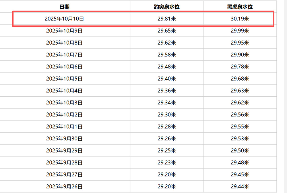 记者查询相关信息了解到,黑虎泉地下水位曾在2004年、2005年、2010年、2021、2022年突破30米“大关”,最高水位分别为30.82米、30.16米、30.18米、30.46米和30.62米。其中,2004年8月30日、31日,最高地下水位均为30.82米,当年30米以上的水位持续了80余天。2021年国庆假期济南连续降雨,黑虎泉地下水位在10月2日突破30米“大关”,10月18日达到30.46米,成为当年最高水位。2022年8月15日,在强降雨的助力之下,黑虎泉水位达到30.01米,创下2005年以来历史同期最高水位,到了10月10日达到当年的最高水位30.62米。