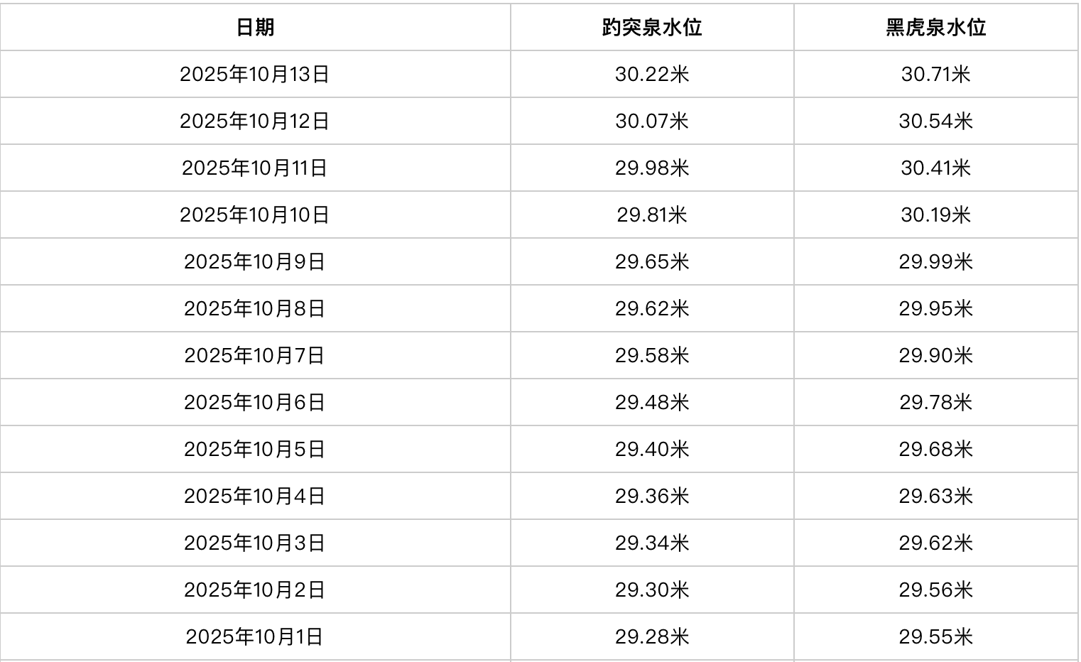 资料显示,2022年10月11日,趵突泉地下水位曾涨至30.27米,创下1966年以来最高地下水位纪录。目前,趵突泉距离这一水位线仅差5厘米。