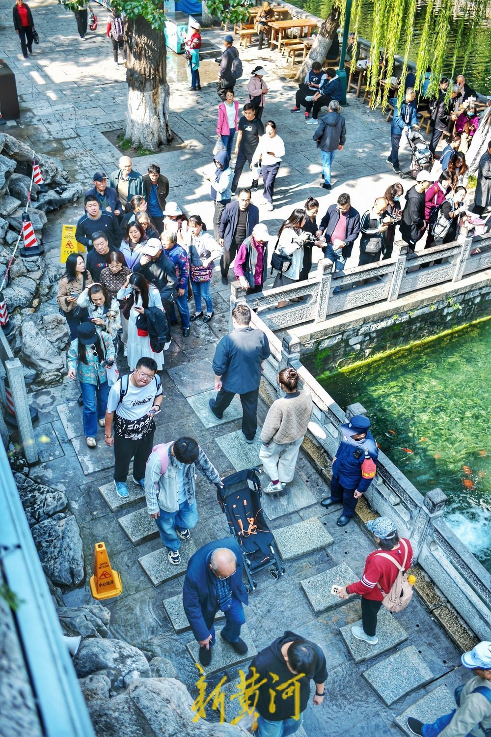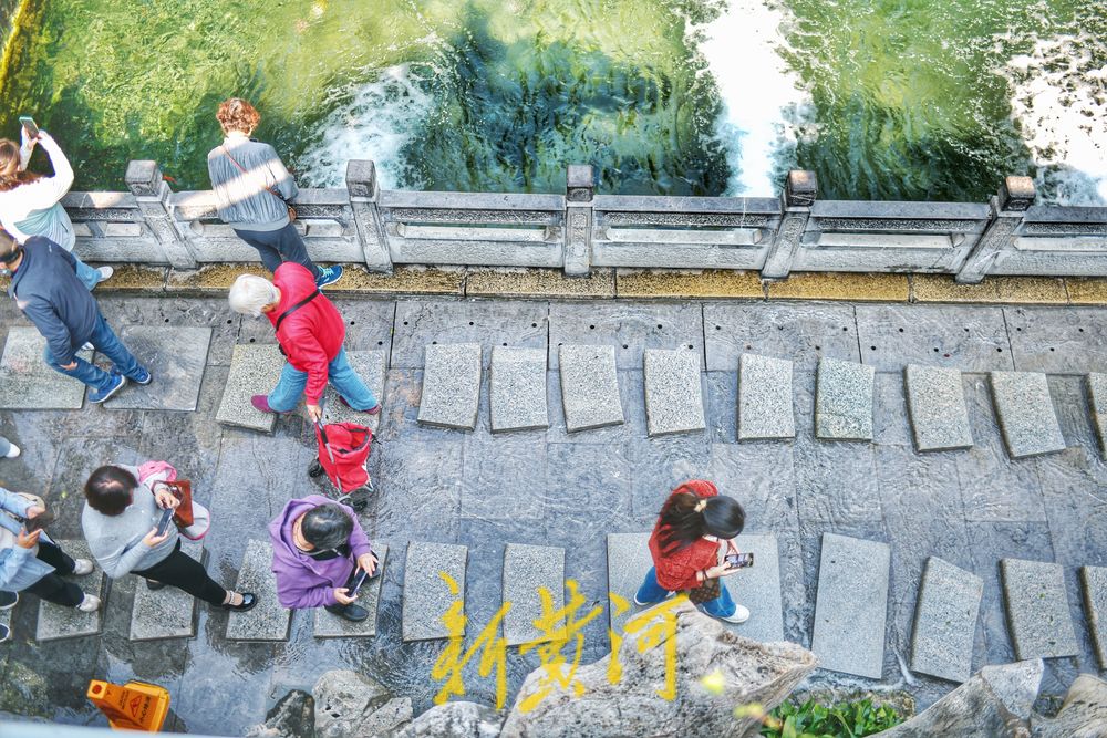 由于水位达到罕见高度,泉水甚至从岩壁洞穴中汩汩涌出,勾勒出难得一见的“清泉石上流”奇观,成为网红打卡点。