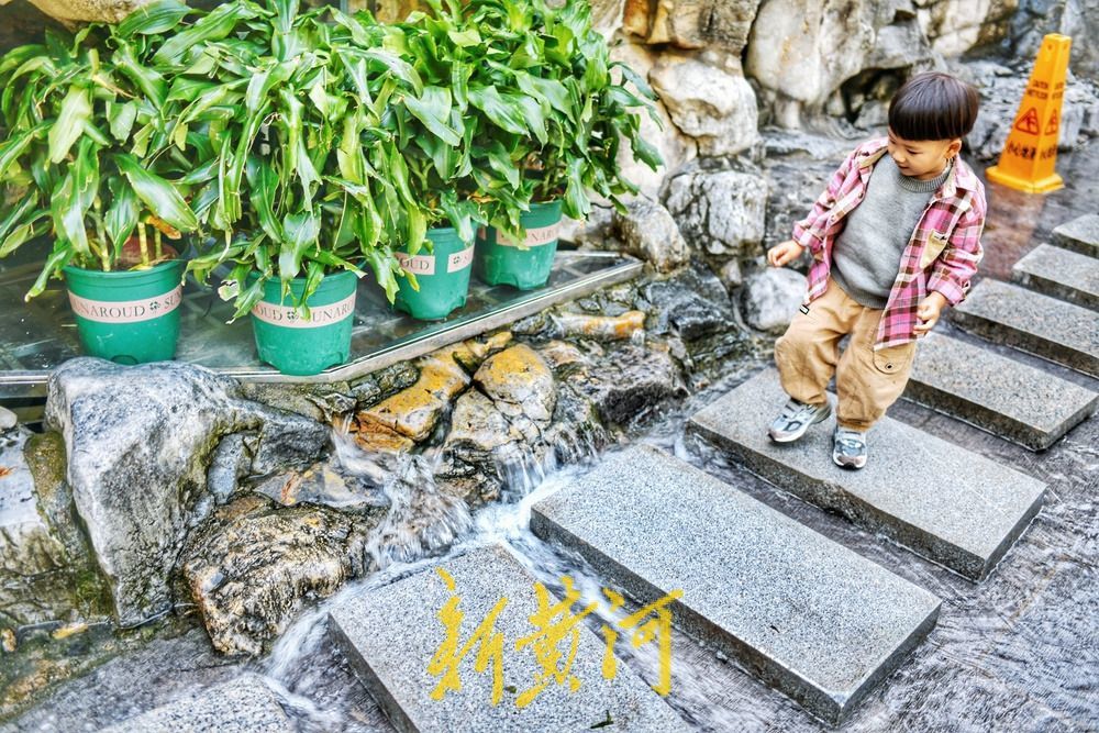 景区工作人员在洞口周边的地面上铺设了石板,过往游客踩着石板感受泉水喷涌。