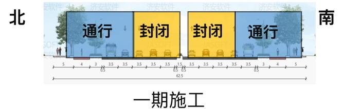 一期:封闭道路南北半幅内侧2车道进行铣刨及病害处理,社会车辆沿剩余车道通行。除路口外,采用全天施工的方式,路口范围非高峰期施工。
