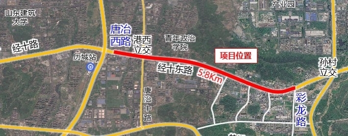 经十东路邢村立交至彩龙路段改建工程道路面层施工西起唐冶西路口西侧,东至彩龙路口东侧,全长约5.8公里,本次工程施工内容为机动车道局部病害处理、整体铣刨罩面。