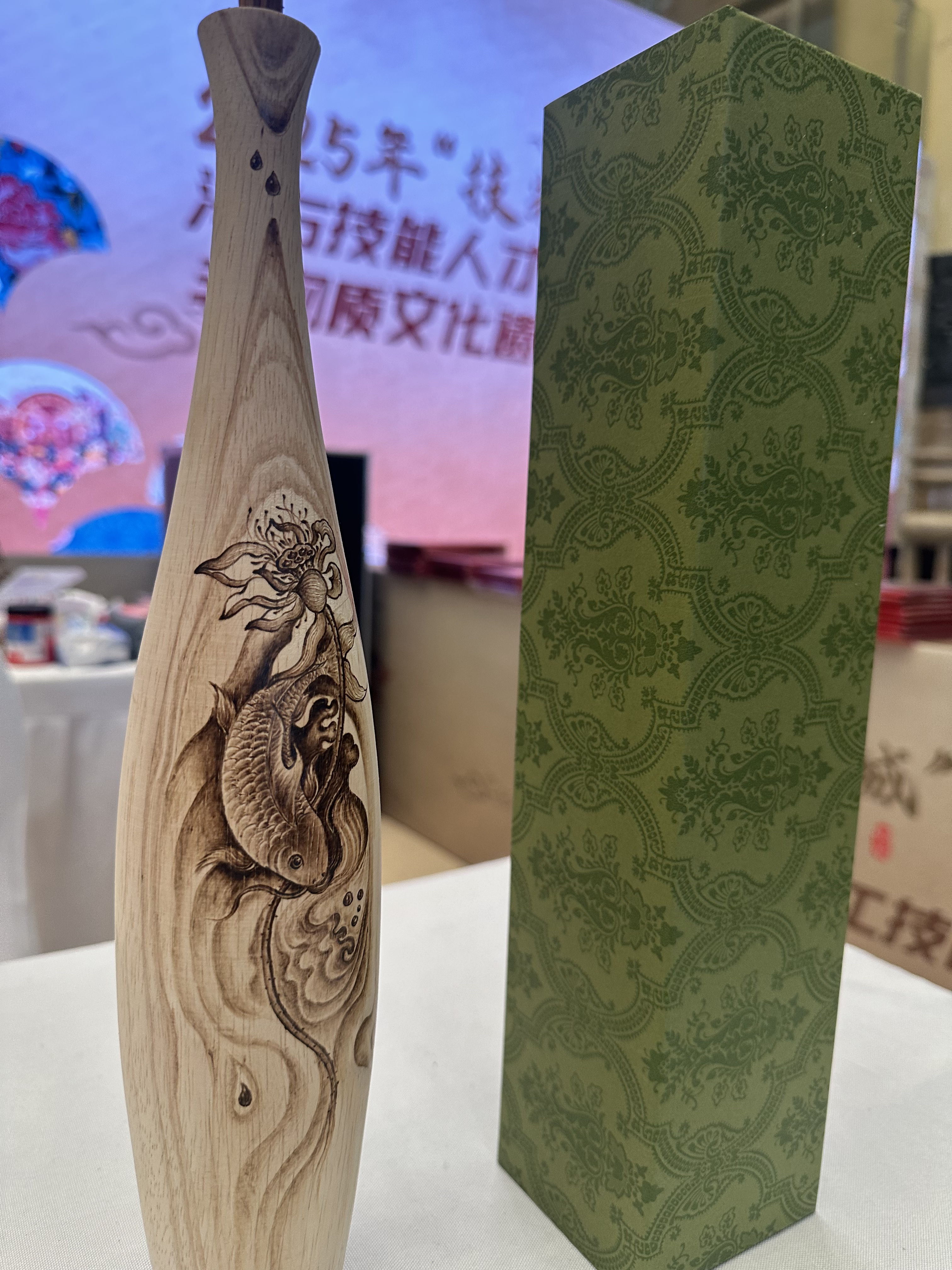活动现场,山东省工艺美术协会会员、济南市民间文艺家协会会员赵敏的参赛作品《泉韵》吸引了记者的目光。赵敏说,“通过荷花、锦鲤、泉水来表达对和和美美、连年有余的美好期望。我这次采用木质花瓶是比较创新的烙画载体,不但可以更好地发挥艺术的表达性,还可以根据木质纹理来创作,设计出泉水‘涓涓不息’的笔触,完美地将传统工艺和创新理念融合在一起。”