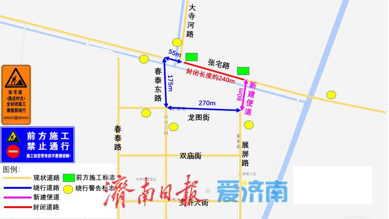 济南热力集团有限公司计划于2025年10月25日零时起在张宅路(路店村北)进行热力管道施工。为确保施工期间道路通行安全、有序、畅通,现将施工期间交通组织方案进行公告。