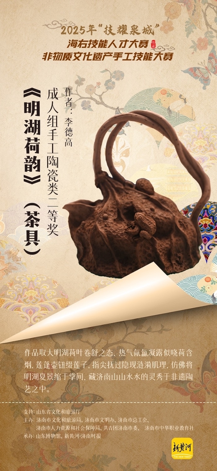 2025年“技耀泉城”海右技能人才大赛——非物质文化遗产手工技能大赛决赛结果出炉。山东省工艺美术协会理事、章丘制陶技艺代表性传承人李德高的作品《明湖荷韵》获成人组手工陶瓷类二等奖。