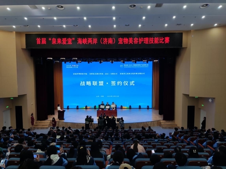 赛前举行了启动仪式。济南护理职业学院书记周敬在致辞中表示,希望通过比赛,两岸参赛选手能够赛出水平、赛出友谊,让比赛成为两岸青年携手并肩的起点。台青代表在发言中表示,期待通过比赛与大陆同行相互切磋、共同进步,为推动两岸宠物行业融合发展贡献一份力量。济南护理职业学院、名将宠美教育科技(北京)有限公司、亚太易和文化传媒有限公司在启动仪式上签订三方战略合作协议。济南市台办主任赵博与济南护理职业学院院长曹爱民共同为“泉来爱宠”鲁台产业联盟揭牌。