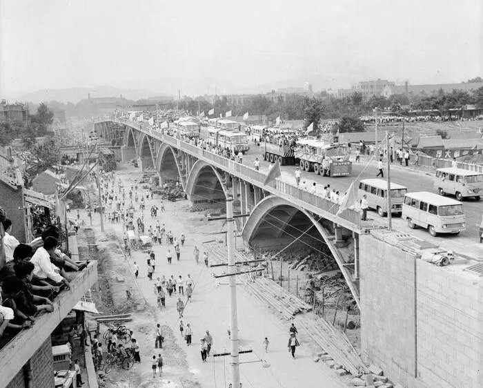 随着社会发展,老天桥越来越不能适应时代要求。1973年,老天桥拆除,次年年底重建工程破土动工,新天桥于1975年7月1日正式竣工通车。
