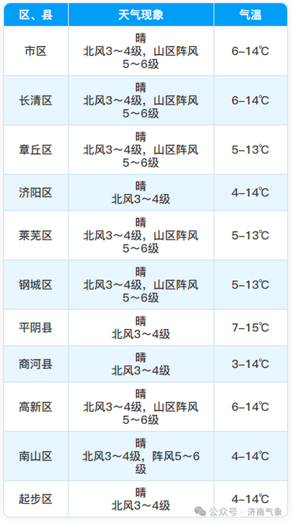 今天(11月1日)济南天气以晴为主,白天气温升高,明天(2日),晴朗天气延续,最高气温将下滑到14℃,请适时调整着装,谨防感冒。