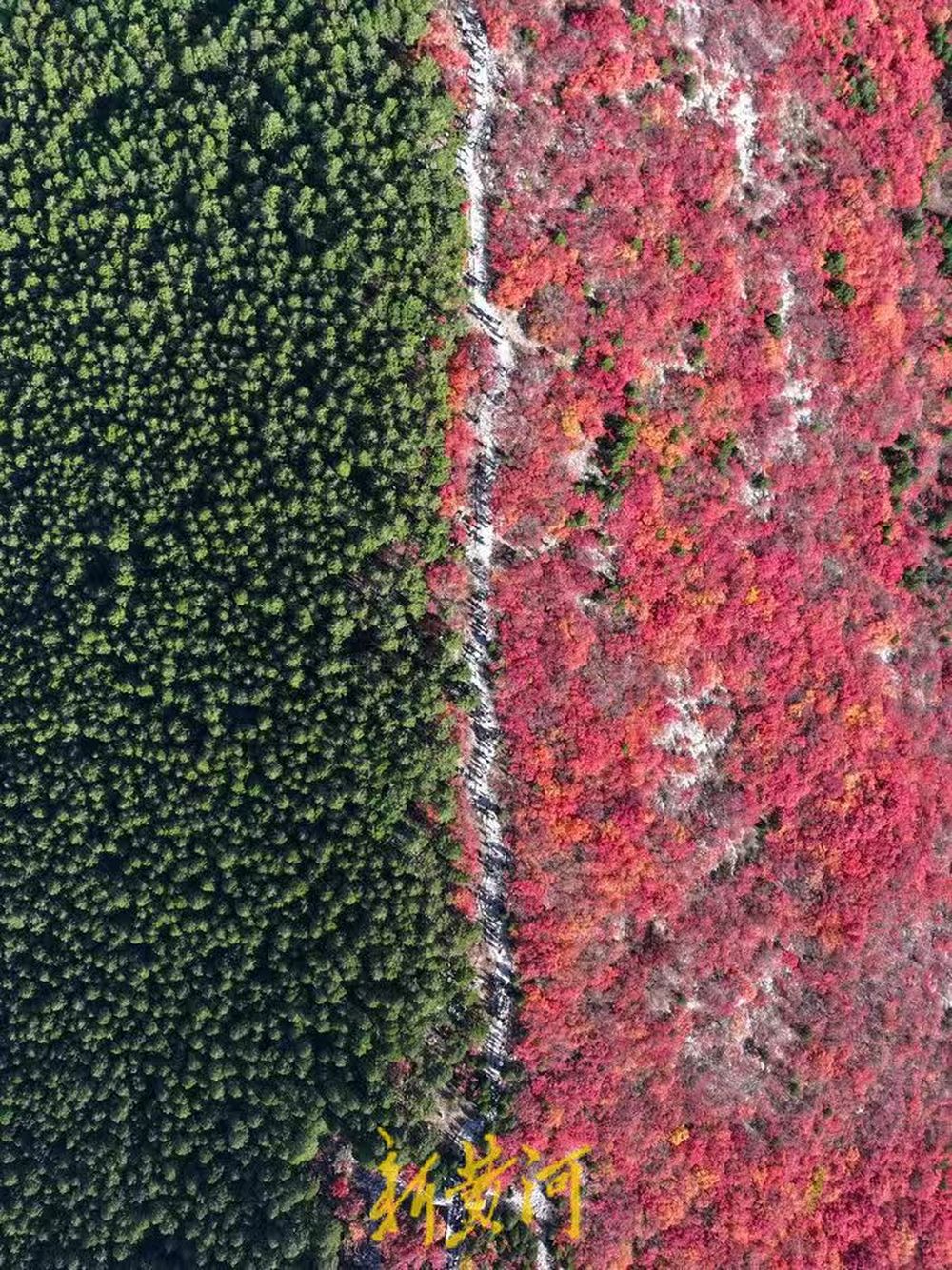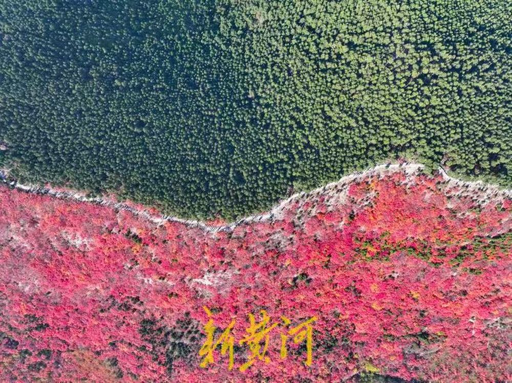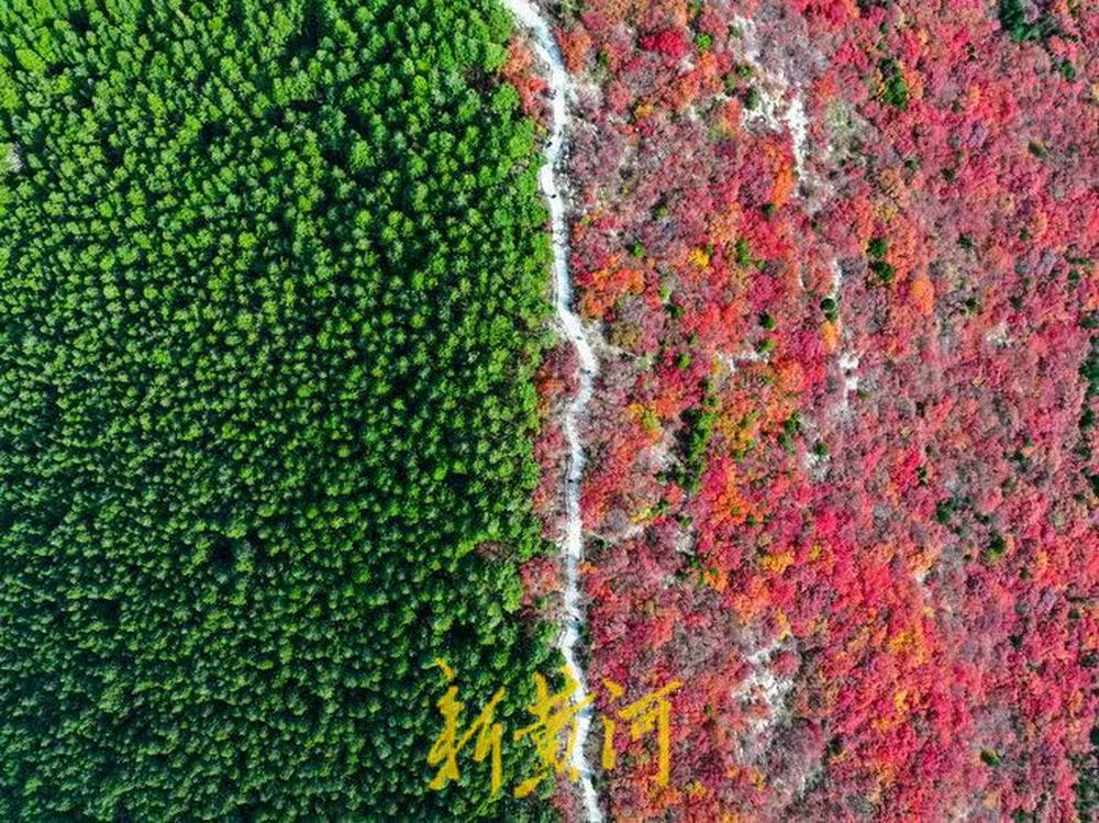 以山脊为界,南侧黄栌层林尽染,绚烂如火;北侧松柏苍翠挺拔,绿意盎然。鲜明的色彩对比构成一幅巨大的自然“鸳鸯火锅”,场面壮观。