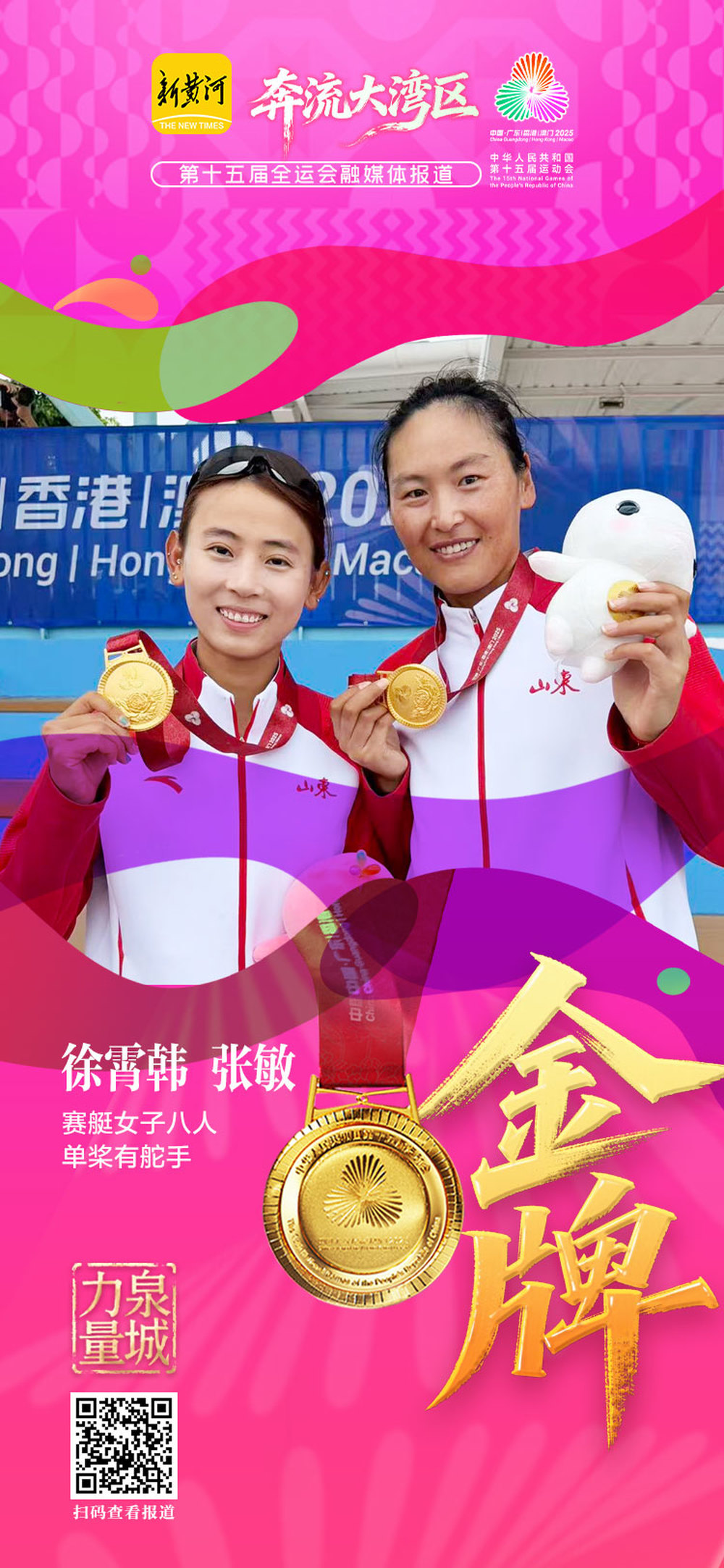 与张敏交相辉映的是新生代选手的崛起。张元泽在2021年十四届全运会上收获一金一银后,本届成功卫冕,展现出济南赛艇人才的良好延续性。2002年出生的徐霄韩,则从2014年进入济南赛艇队训练开始,一步步成长为亚运冠军、全运冠军,她的成长轨迹印证了济南赛艇项目“精准选材、科学训练、匠心培育”育人模式的科学性与有效性。两金一银的成绩,是济南赛艇项目长期积累、系统布局的必然结果,也为济南竞技体育事业注入了强劲动能。